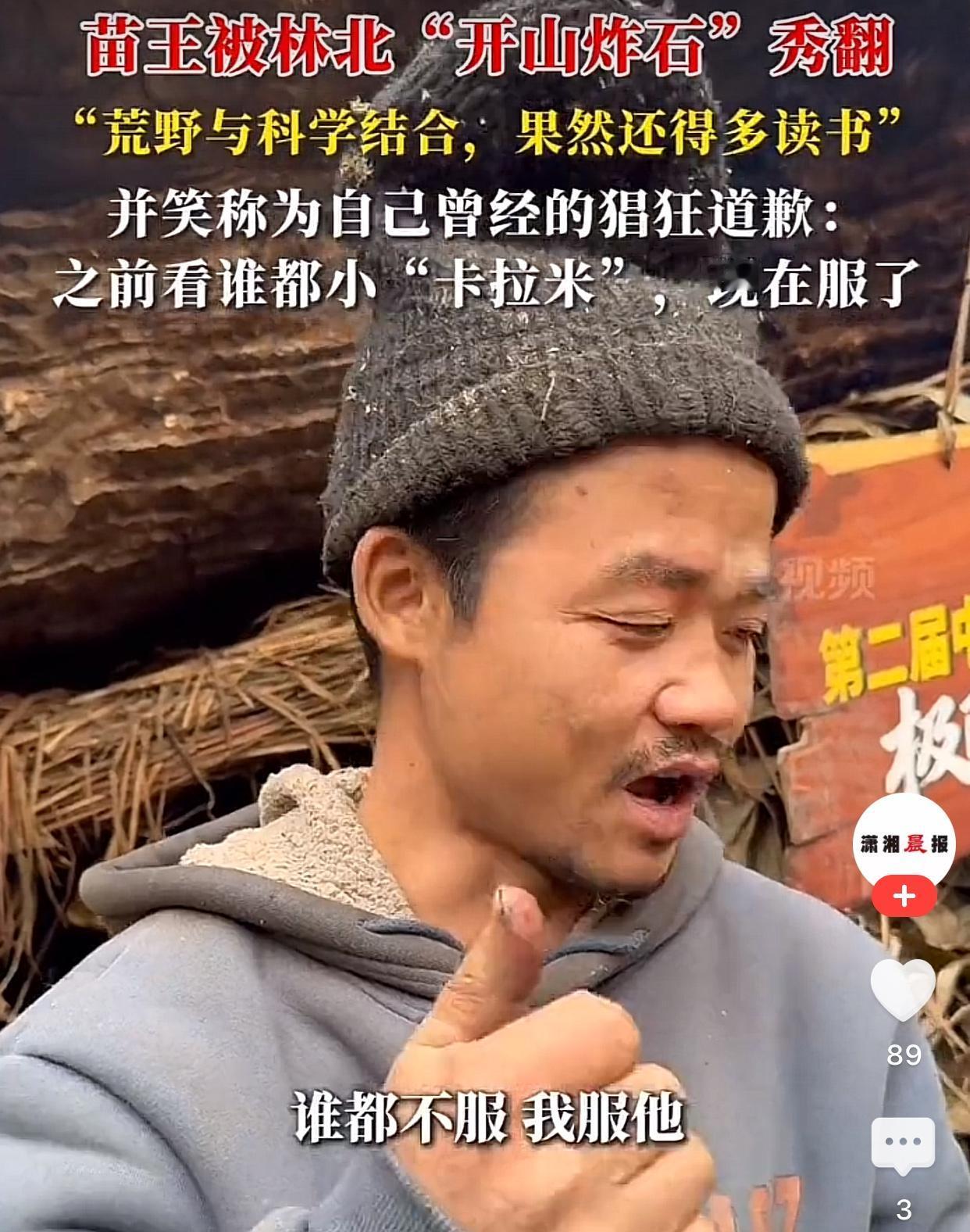 苗王被林北的“开山炸石”震撼到了,说:谁都不服,我服他。 苗王这样夸林北:“我