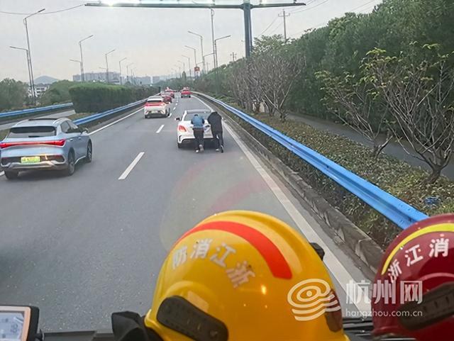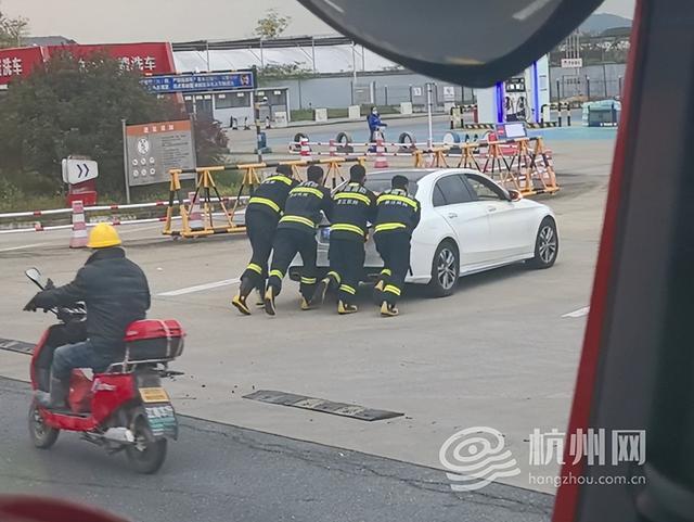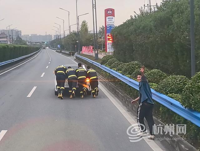 11月12日下午,杭州临浦消防救援站的消防车在出警归队途中,远远望见前方道路上,两名年轻人正弓着腰、吃力地推着一辆私家车缓缓挪动。车辆占据部分车道,过往车辆不得不减速避让、小心绕行,现场通行略显受阻。