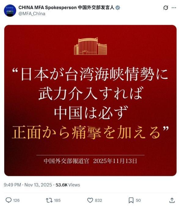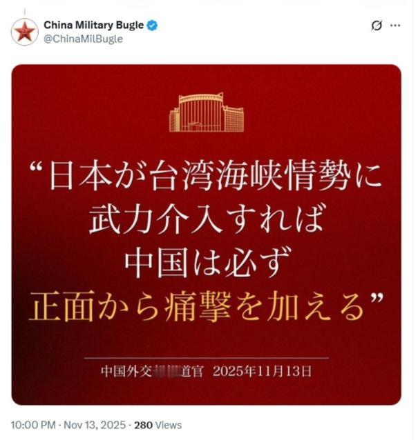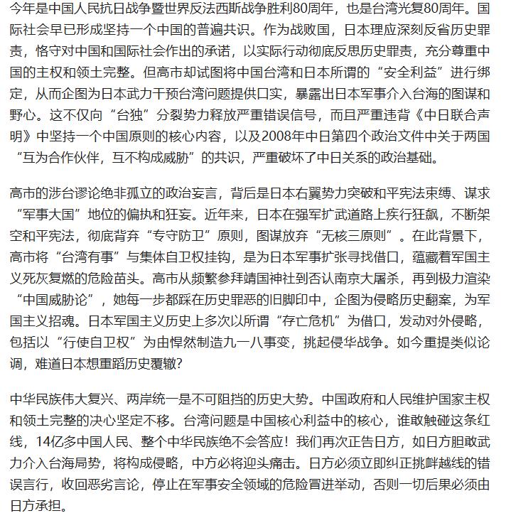 事情大了!高市早苗恐难收场!人民日报发表钟声文章:绝不容忍高市早苗在台湾问题上的越线挑衅! 内容写道:近日,日本首相高市早苗在国会公然宣称“台湾有事”可能构成日本可行使集体自卫权的“存亡危机事态”,暗示可能武力介入台海问题。这是对中国内政的粗暴干涉,是对一个中国原则的背信弃义,是对二战后国际秩序的公然挑衅。 另外文章中还提到,高市的涉台谬论绝非孤立的政治妄言,背后是日本右翼势力突破和平宪法束缚、谋求“军事大国”地位的偏执和狂妄。并质问高市早苗如今重提类似论调,难道日本想重蹈历史覆辙? 钟声文章中明确写道:中华民族伟大复兴、两岸统一是不可阻挡的历史大势。中国政府和人民维护国家主权和领土完整的决心坚定不移。 台湾问题是中国核心利益中的核心,谁敢触碰这条红线,14亿多中国人民、整个中华民族绝不会答应! 我们再次正告日方,如日方胆敢武力介入台海局势,将构成侵略,中方必将迎头痛击。日方必须立即纠正挑衅越线的错误言行,收回恶劣言论,停止在军事安全领域的危险冒进举动,否则一切后果必须由日方承担。 从中国当下的反应来看,这事日本恐怕难以收场了,日本方面必须要有所做为,高市早苗必须为自己的言行买单,可不是他一句不收回,不讲了就能轻易把这事给掀过去,中国表明的态度已经非常清楚,就是在清清楚楚的警告高市早苗,这事没完。 一方面,日本方面需要纠正挑衅越线的错误言行,二方面,高市早苗必须收回恶劣言论,这里说的是收回,而不是高市早苗那一副无所谓就这样结束的态度。第三个方面,高市早苗的涉台言论是带有军事性质的,也必须停止任何的冒进举动。 另外,中国军号和中国外交部发言人的官方账号,都直接用日本进行了发贴,内容明确写道:如果日本武力介入台海,必遭迎头痛击。所以能够看的出来吧,这就是我们官方的态度!另外在11月13日,我国外交部副部长孙卫东也因高市早苗恶劣的涉台言论,奉示召见日本驻华大使金杉宪治,提出严正交涉。 日本这个国家很特殊,尤其是对于中国而言,所以对于日本,14亿中华儿女是真的能够做到劲往一处使。所以我们等待高市早苗继续对其涉台言论再进行补充,并明确向中国道歉