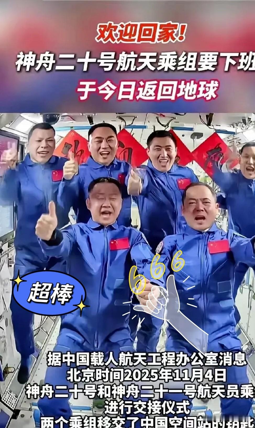 神舟二十号绝顶了[赞][赞] 神舟二十号原计划与神舟二十一号在轨交会后共同完成回程任务,随后二十一号乘组再执行一段时间的独立飞行。 没想到由于碎片轨道经过高度与二十号相同,且与回程轨道交会角度较大,导致二十号回程时有可能与碎片相遇,碰撞风险很高,因此不得不延迟二十号的回程时间。而二十一号乘组正好在空间站工作了一段时间,随时可以与二十号乘组联合开展实验。 起初大家对安全问题很担心,但很快就发现二十号乘组的吃饭、锻炼、睡觉都和我们一样按时进行。乘组成员还用在地面时的方法种出了新鲜的空间蔬菜。按照既定计划完成了细胞培养、涡虫再生等实验项目。 空间站的设施也都准备的非常充分,6人共同使用没有问题。我们通过远程会诊评估风险,调整方案,确保安全,延迟几天的飞行任务,成为了航天人磨合、合作、共同奋进的新机会,为后续乘组进驻空间站工作积累了宝贵经验。必须为他们点赞👍🏻👍🏻👍🏻👍🏻