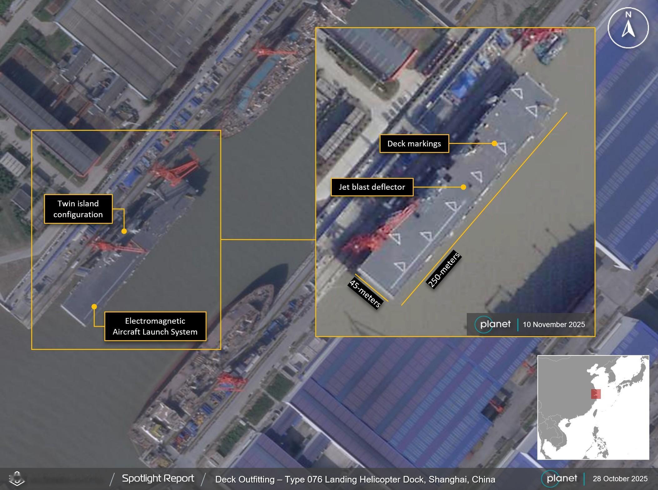 之前的076高清卫星图,8个直升机起飞位清晰可见 图源推特