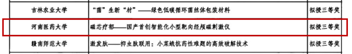 日前,第十九届“挑战杯”中国移动全国大学生课外学术科技作品竞赛主体赛决赛在江苏南京举行。由河南医药大学第二附属医院李文强教授指导,第二临床学院、基础医学院本科生组建的“磁芯疗郁——国产首创智能化小型靶向经颅磁刺激仪”项目团队斩获“三等奖”。此次获奖,是该院在读大学生首次闯入挑战杯国赛,填补了在该领域的空白。