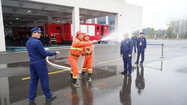 干粉灭火器灭火操现场,指令一出,参赛选手们如离弦之箭,着装、冲刺、拔销、提管、按压、喷射,动作一气呵成,瞬间将“火魔”制服,展现了扑救初起火灾的“快准狠”。
