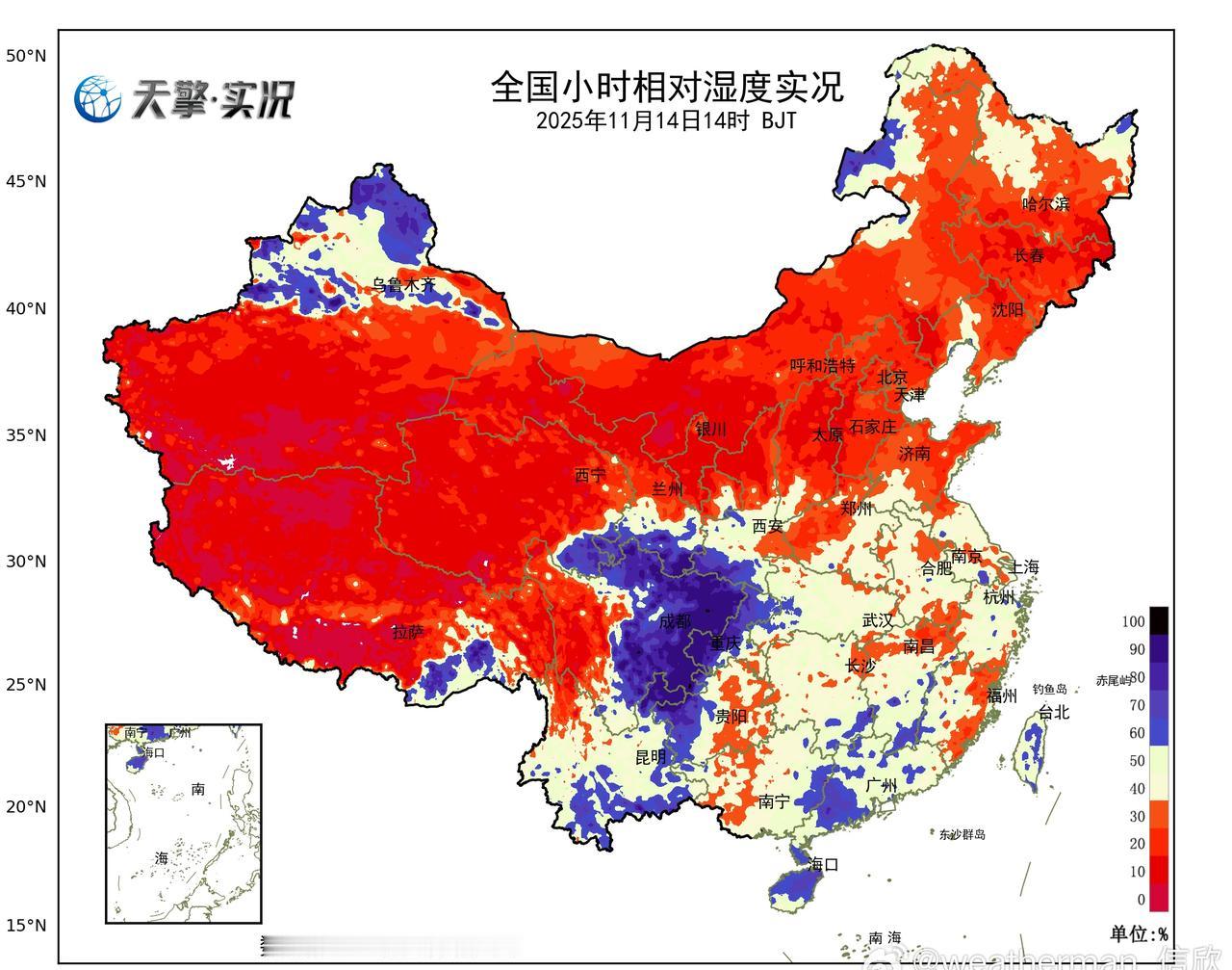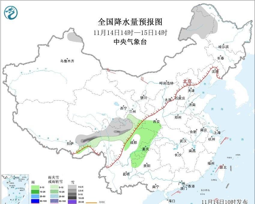 【降水和干燥】今天08-14时,我国降水稀少,主要在四川重庆有些小雨,新疆北部的降雪收敛。今天下午高原地区以及北方大部,空气干燥,银川相对湿度只有14%。因为总体上水汽条件差,今天下午到明天中午,我国的降水也不多。内蒙古东北部、西藏东北部、四川西北部可能有降雪,四川东部、重庆等地有小雨。