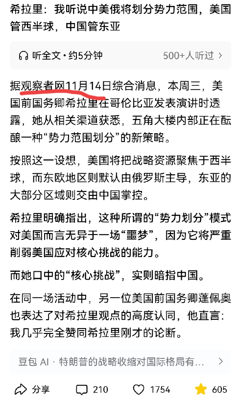 2、人工智能显示,目前也无任何权威媒体记录希拉里在哥伦比亚发表相关演讲,内容中 “三分天下” 的描述既无信源支撑,也与美方战略调整的核心逻辑(“美国优先” 的资源重新分配)相悖
