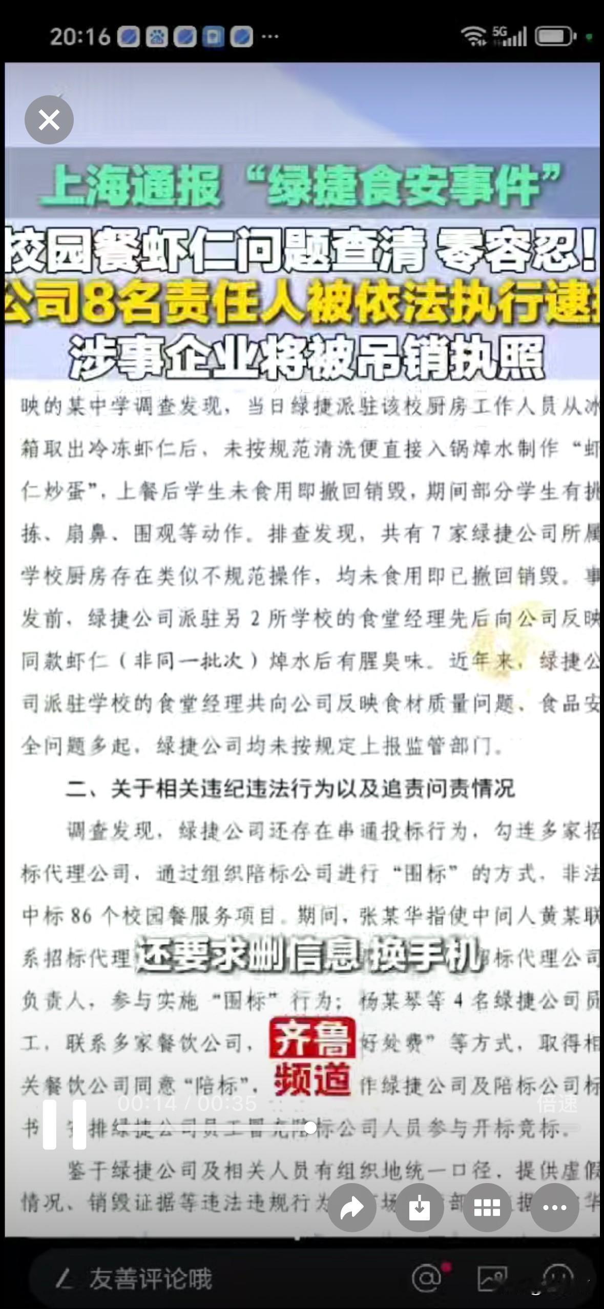据央视网报道,上海绿捷公司“臭虾仁”事件调查结束,处理结果已经发布! 看到调查通报,那些吃了午餐的孩子的家长们可能今晚都睡不着了。 简直是太恶劣了!操作不规范,有的食材未清洗就直接制作,臭了的也做给学生吃! 令人发指! 他们的良心都哪去了?这可是给孩子们吃的东西啊,居然大胆如此 期待法律给予他们严厉的惩罚! 取材网络,材料来源:央视网快看,齐鲁频道。
