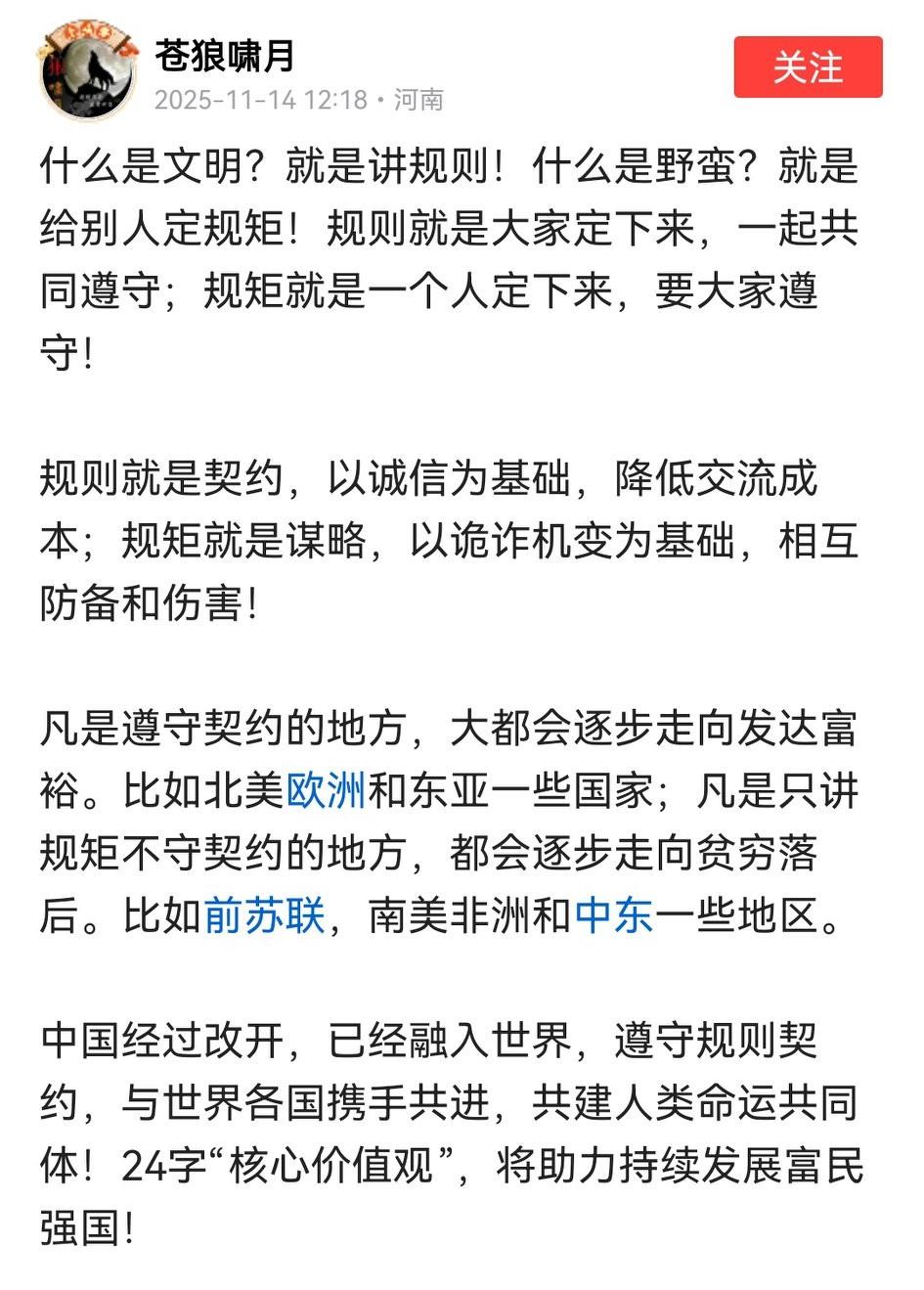 这个苍狼啸月,不仅批判了薛剑领事,说他"搞打打杀杀",怕影响国家关系。 后来看形势不对,就偷偷删除了。 今天又发了“规则”,“契约”,甚至直接露骨的夸“北美”和“东亚一些国家”! 请问苍狼先生,北美主要国家除了加拿大哥和美国,墨西哥,古巴,危地马拉等,他想夸谁?美国讲契约?规则?笑话! 东亚除了我们,日本,韩国,朝鲜和蒙古,他又想夸谁? 最后一段才提出中国,那前半部分是不是夹带私货?!