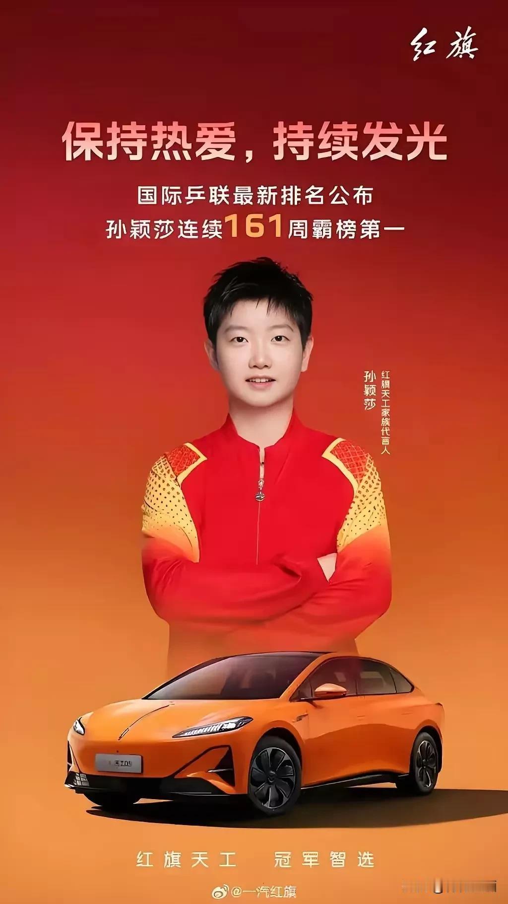 见过厉害的,没见过这么厉害的! 1、连续173周保持世界排名第一 2、‌首位00后世界第一‌ 3、荣获世乒赛金满贯‌,比肩刘胖 如果你也想感受赛场那份热血沸腾,那就跟孙颖莎一起,和红旗天工05来一场青春之旅的约会吧! 坐进车里,就能拥有专属的视听盛宴:65寸AR-HUD,沉浸玩享巨幕,视野全面升级,语音可控制车内温度,方向盘手柄体验云游戏,支持倒车影像,看电影,爽不爽? 全车标配丹拿品牌音响,12个扬声器铺陈环绕声场,不管是轻快的流行曲还是悠扬的古典乐,都有余音绕梁的韵味。外接麦克风就能开启移动KTV,一展歌喉,惊艳众人,嗨不嗨? 红旗天工自带代驾模式+哨兵模式,紧急制动辅助、9H4M笼式车身结构,最高强度2000Mpa,全车9安全气囊全方位保护、IPX8防水等级电池,可承受120小时浸水,酷不酷? 红旗天工05,15万级的起步价,就能和乒乓国手孙颖莎拥有同一款座驾,外观亮眼,性能卓越,一车在手,王者归来!爱不爱?