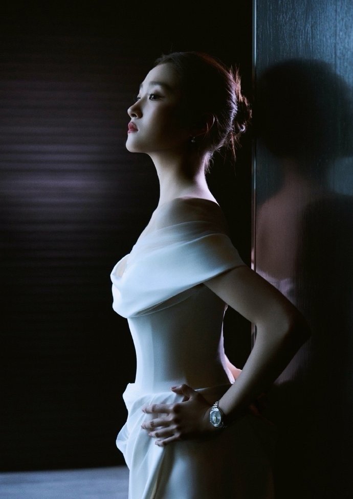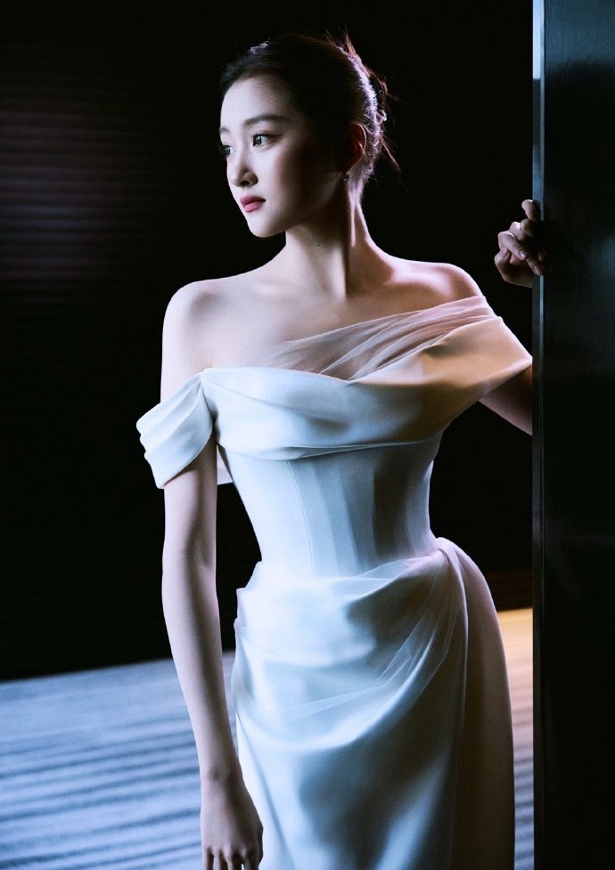 光影交错间,关晓彤 身着一袭白色抹胸长裙翩然而至。裙身剪裁优雅,勾勒出她纤细的身