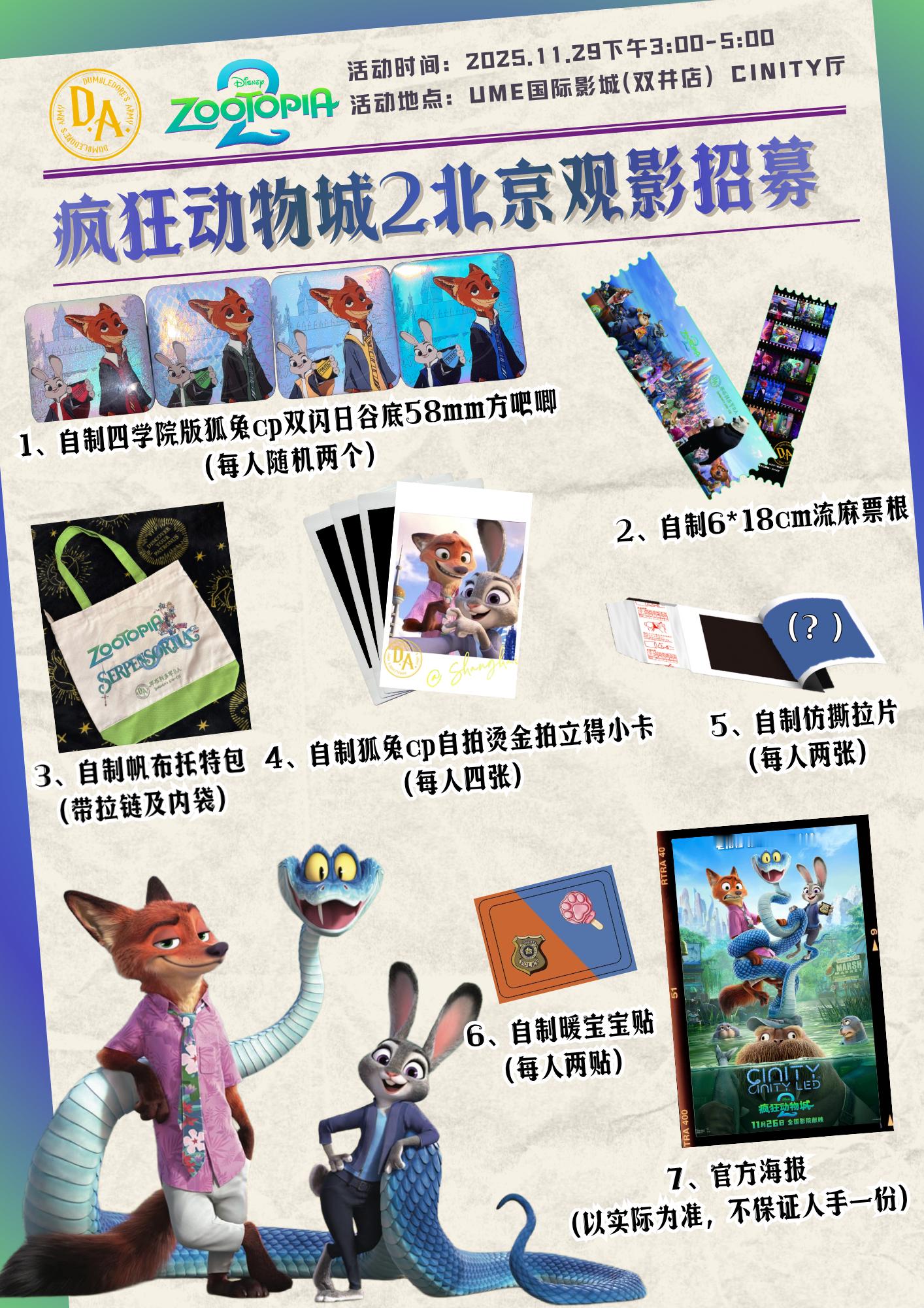 11.29 15:00左右《疯狂动物城2》观影招募!📍北京朝阳CINITY巨幕 | 📍上海顶奢IMAXcos自由+物料狂欢预警!独家自绘自制周边、官方海报、超多抽奖全都有!速戳 锁定观影名额,和同好一起嗨翻全场~