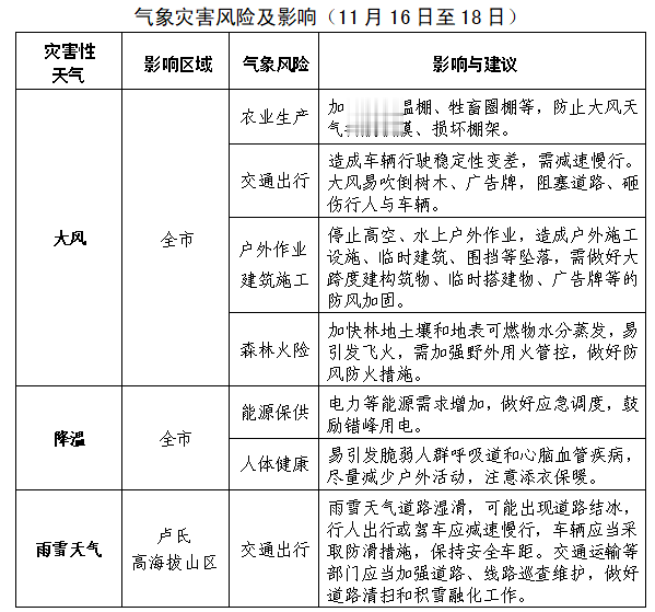 ●11月16日:阴天有小雨或零星小雨,夜间转雨夹雪或小雪,卢氏有中到大雪,偏西风3-4级,阵风6-7级,气温-2到13℃,高海拔山区-4到8℃。