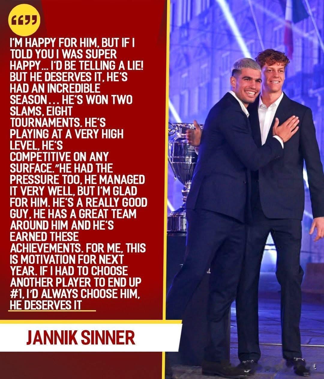 辛纳谈阿尔卡拉斯锁定年终世界第一:“我为他感到高兴,但如果我欣喜若狂,那就太假了!不过他实至名归,他度过了一个不可思议的赛季,他夺得两个大满贯冠军,八项 锦标赛冠军。他太强大了,在任何场地都极具威胁。即使他有很大压力,但他处理得很好,我为他感到高兴。他是个非常好的小伙子,他身边有很棒的团队,一切他都值得。对我来说,这是明年的动力,如果让我选另一个球员最终排名第一,我永远都会选他,他配得上这个荣誉。”