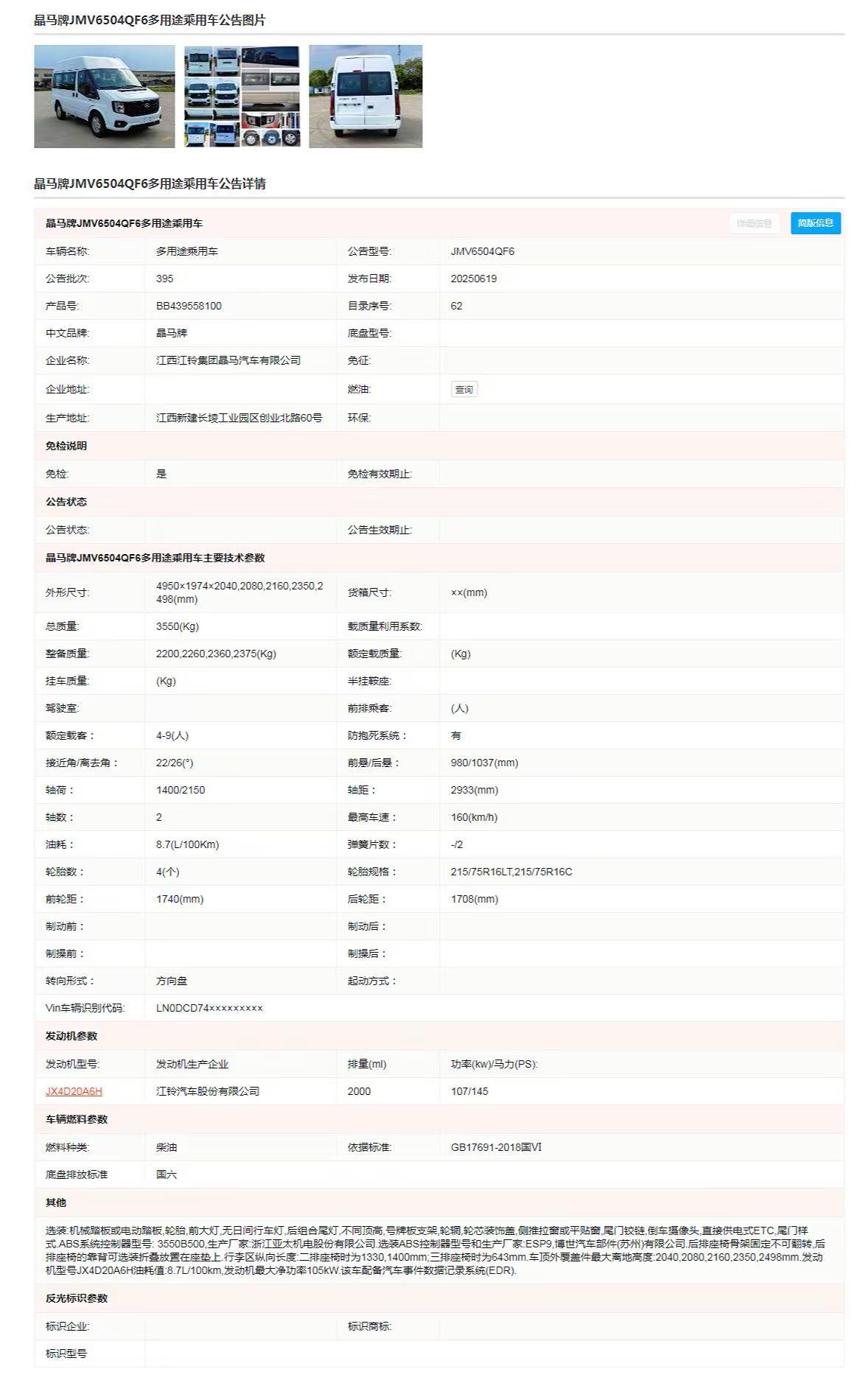 江铃晶马福享四驱真的来了!在工信部第395批《道具机动车辆生产企业及产品公告》公示完成后,江铃晶马福享四驱底盘将于2025年11月正式迈入量产阶段!🚐从公告系统上可以查询到,该款底盘备案的是“多用途乘用车”车型,隶属于小型普通客车范畴。用该底盘改装宿营车或者旅居车后,可以享受同家用小车同样的10年两审的年检政策及相关节假日高速通行免费政策。🚐JMV6504QF6关联的是短轴车型,高度包括2080mm的超低顶,2160mm的低顶,2350mm的中顶以及2498mm的中高顶。🚐该底盘车采用江铃JX4D20A6H型号的2.0T柴油发动机,匹配东安8AT自动变速箱,为驾驶动力和平顺性提供了保障!🚐福享四驱底盘的短轴低顶车型可选装后对开门和后上掀门,其它高度车型均只能固定配备后对开门!🚐福享四驱底盘的车身颜色可选方案比较多,满足大部分对个性颜色的需求,主要有:普通金属漆的白色、黑色、银灰色、暗夜蓝,以及特殊金属漆的极夜灰,象牙黄,沙滩黄,熔岩灰等。🚐福享四驱底盘采用的是博格华纳四驱M-LOCK分动箱,拥有智能硬连接双模式,极限越野脱困能力!江铃晶马福享四驱 江铃原厂四驱