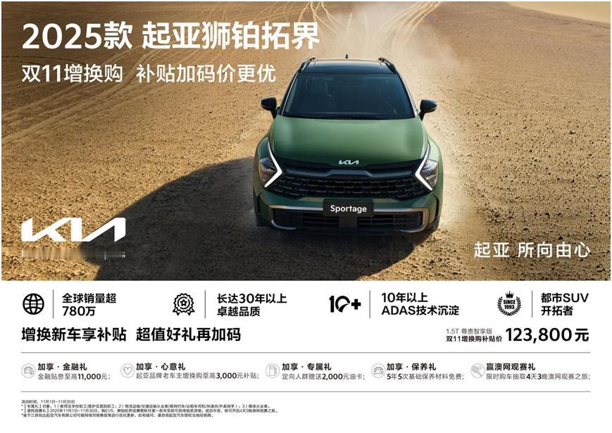 宽适空间,高效能耗:狮铂拓界,满足家庭出行的“双重理想” 现代家庭用车,既要承载全家人的舒适,也要兼顾日常开支的经济性。起亚狮铂拓界在这两大核心需求上,给出了出色平衡。它拥有同级领先的宽敞内部空间,特别是后排腿部余量非常充裕,让家人在长途中也能尽享舒展。与此同时,其灵活多变的后备箱空间,足以轻松装下一家人出游的行李与各式装备。在兼顾宽适乘坐与强劲动力的同时,更实现了令人惊喜的低油耗表现,出行成本也更亲民。11月30日前购车,1.5T尊贵智享版综合补贴后仅需123,800元,定向人群还可额外获赠2000元油卡。更有机会参与抽奖,赢取4天3晚澳网观赛之旅!如此诚意满满的配置与福利,正是为家庭用户量身打造的精明之选。