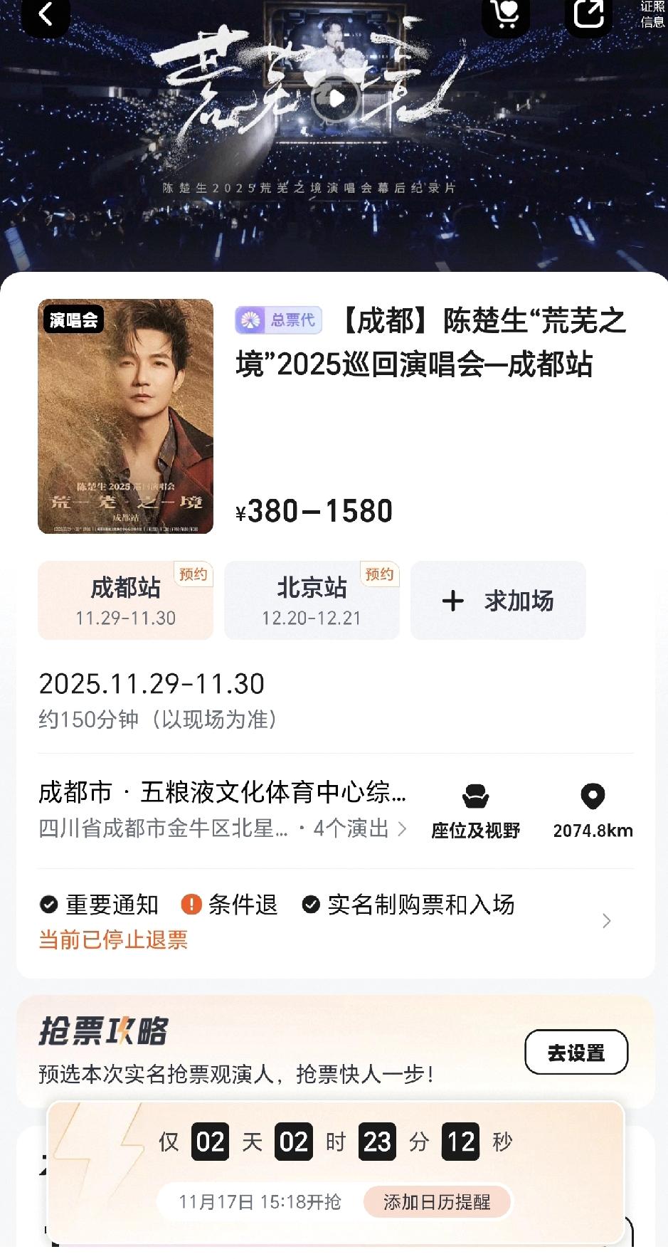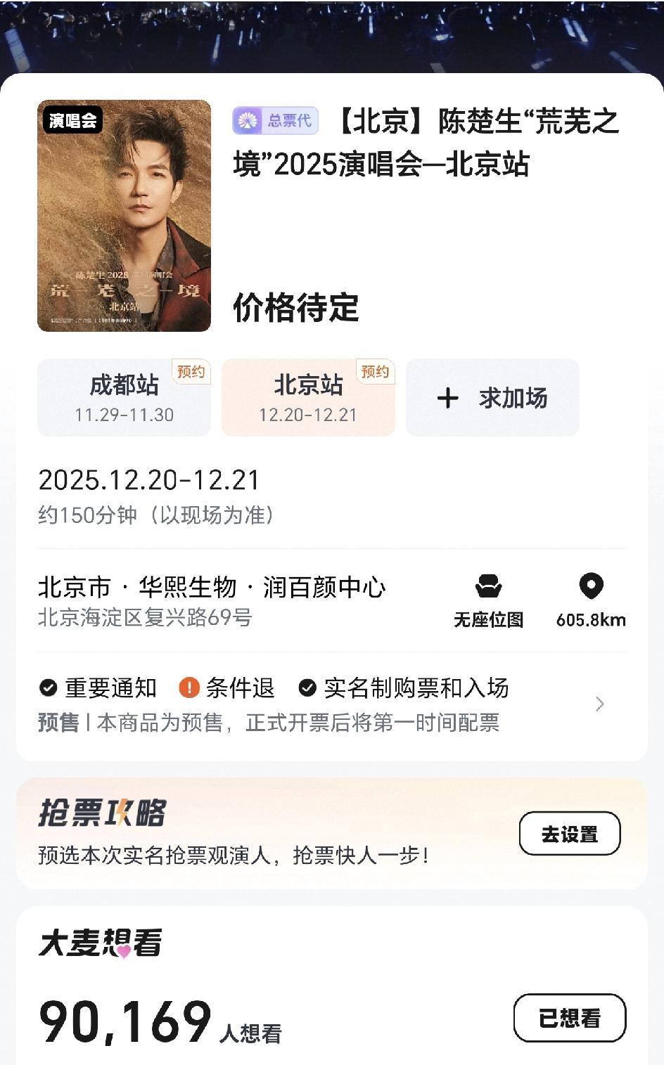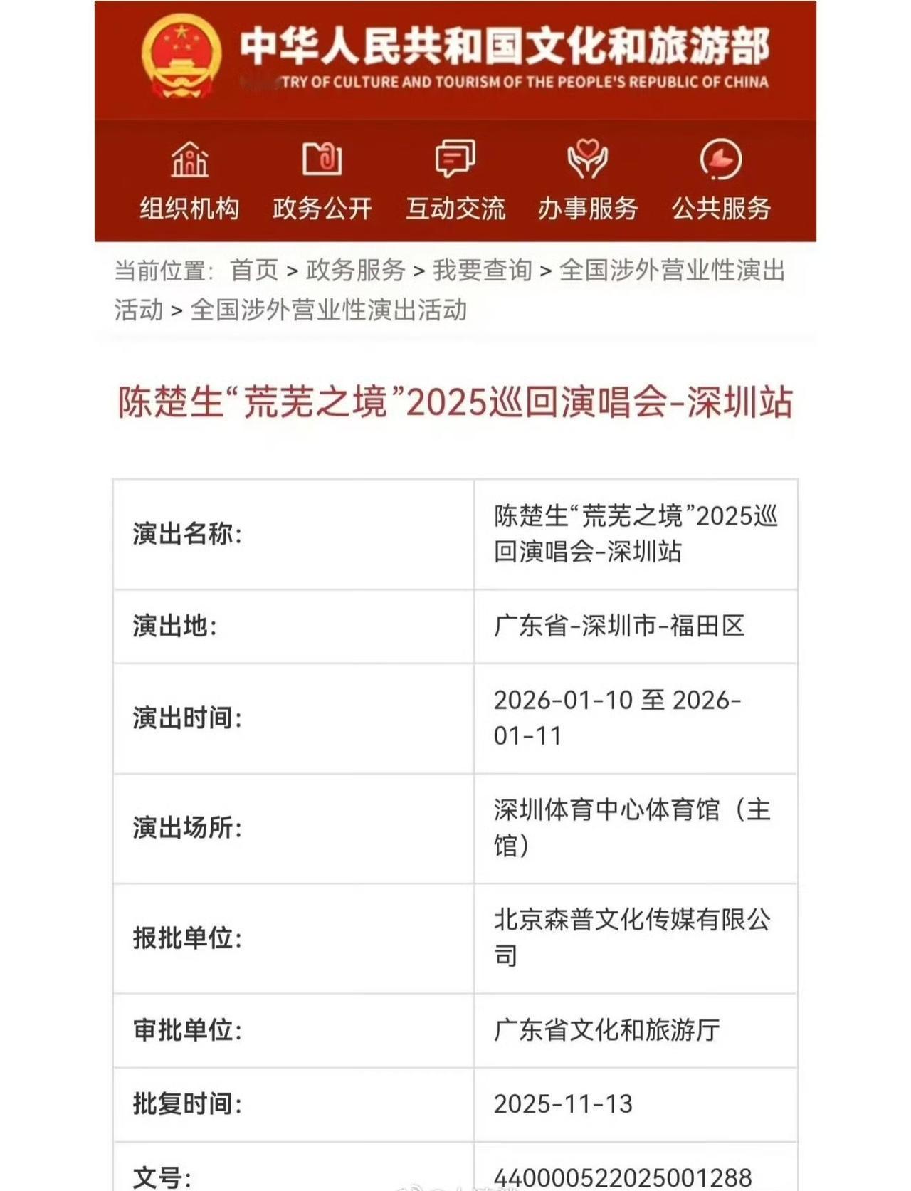 陈楚生《荒芜之境》演唱会又宣一场,深圳2026年1月10~11号,荒芜之境跨年了,这一场会不会是收官? 目前官宣的成都场早已售罄,临近二开,运气好还有机会! 北京场还未开票想看人数接近10万,北京的场馆好小,不用怀疑的开票即售罄,北方场太少了,北京是难得的一次机会,想看的朋友们珍惜吧! 深圳市必开场,深圳,北京,西安,好多有渊源的城市,也分不清哪个城市是他的主场了,反正是很受欢迎。 北京场,期待一个好运气!陈楚生 陈楚生综艺