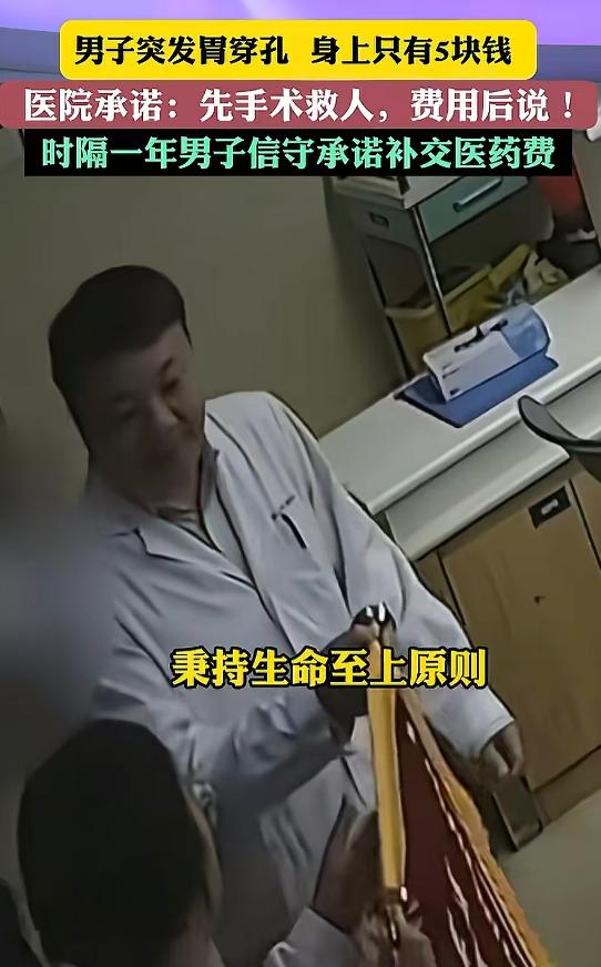 近日江苏无锡,男子来到医院的缴费窗口,把钱递了过去却没有给缴费单,工作人员一问才知道,男子要付的居然是一年半前的医药费。原来,男子是一时赌气离家出走来到无锡的,一年半前突发胃穿孔需要立刻手术,可自己身边一个亲人也没有,全身上下也只有五块钱。 就在男子绝望之时,医院决定开放绿色通道,先手术后收钱,手术完成后,科室的医生护士们还自发为男子捐款,给男子充值饭卡购买护垫等,像家人一样给他换衣服擦身体直到男子康复出院。 出院后的男子因为医生的照顾又重新找到了生活的动力,积极找工作赚钱生活,这个月领到六千块的工资后,男子做的第一件事就来买上水果和锦旗来到医院还钱。 在付完钱后,男子来到当时救助他的科室,把锦旗和水果送给了科室的所有医生和护士,感谢他们半个月的照顾。 再见到当时的医生时,男子止不住的落泪,哽咽着对医生们说:你们就是我生命中的一束光。 有网友说:人是好人、医生是好医生、医院是好医院,缺一不可。 还有网友说:全国的医院都应该看看,这才是医院的典范。 也有网友说:现在这样的医院和这样的医生都太少了,医者仁心,用在他们身上最合适不过。 看了男子的经历,真的要为医生们点赞,在患者遇到困难时愿意自掏腰包排忧解难,如亲人一般照顾男子直到出院,这份打心里为你好的善举,这份善心真让人感动,医者仁心这四个字在医生们身上具象化了。 也要为男子点赞,有恩必须报,一个人身在异地举目无亲,现在他比谁都需要这四千生活,但他能自主把钱拿出来,回报给救命的医院,这份担当也必须鼓励。 你怎么看,评论区说说吧。