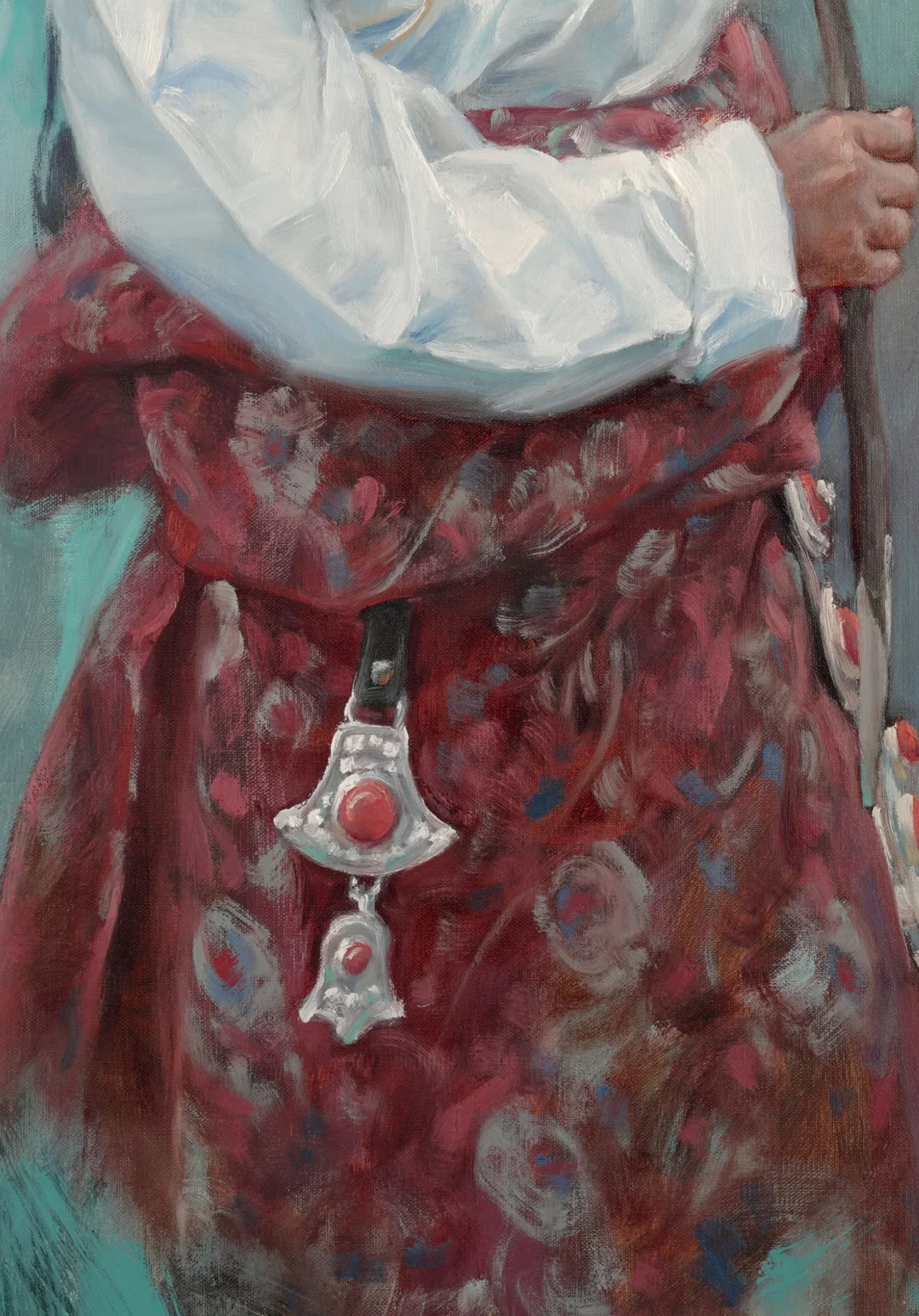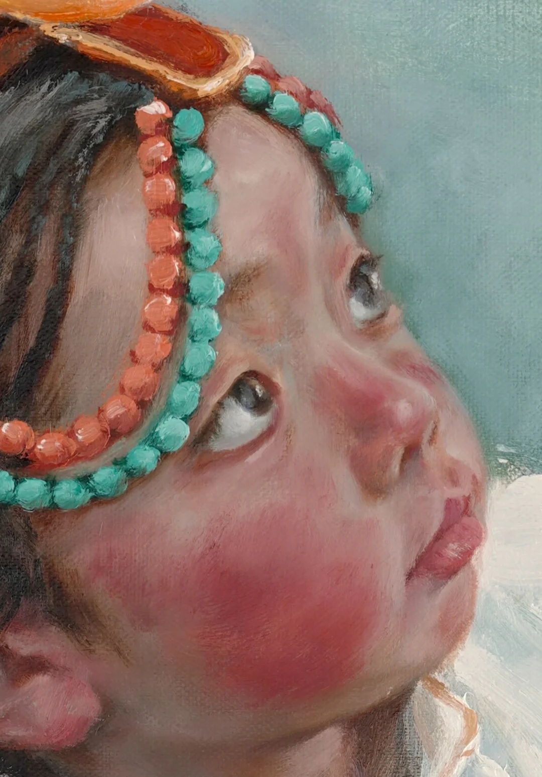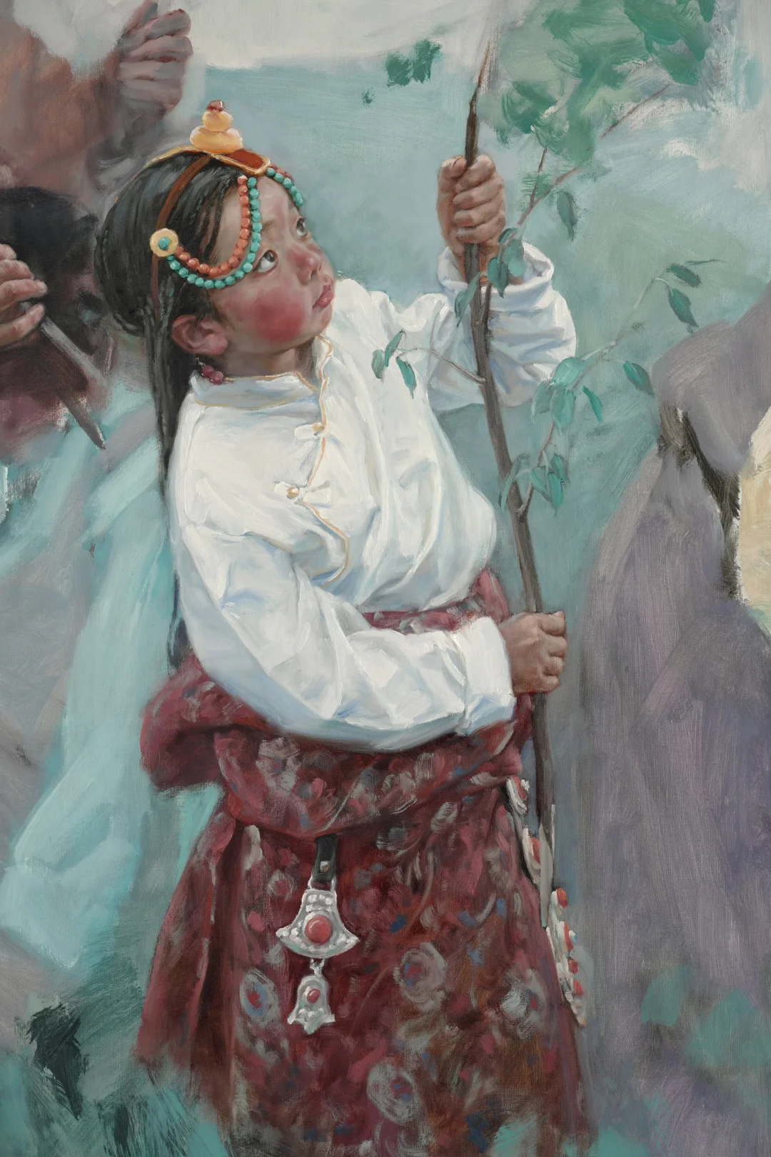 小女孩卓玛琼措刚上小学,来自海拔4500米的玉树州曲麻莱县移民村。我正在创作的这幅大画,表现的是青海黄南州农区的“插箭节”,其中的祭山仪式有妇女举着树枝“祈愿丰饶”的情节。起初画完的小女孩虽漂亮,但个性不够鲜明,少了些可爱的趣味。这让我想起曾在移民村画过写生的卓玛琼措:圆鼓鼓的小脸,单眼皮下是一双大眼睛,非常可爱。于是我决定推翻重画,用这个新形象完全覆盖了之前的版本。昨天刚画完衣服饰品,画中的小女孩便从遥远的玉树,“来到”了黄南的节日现场。
