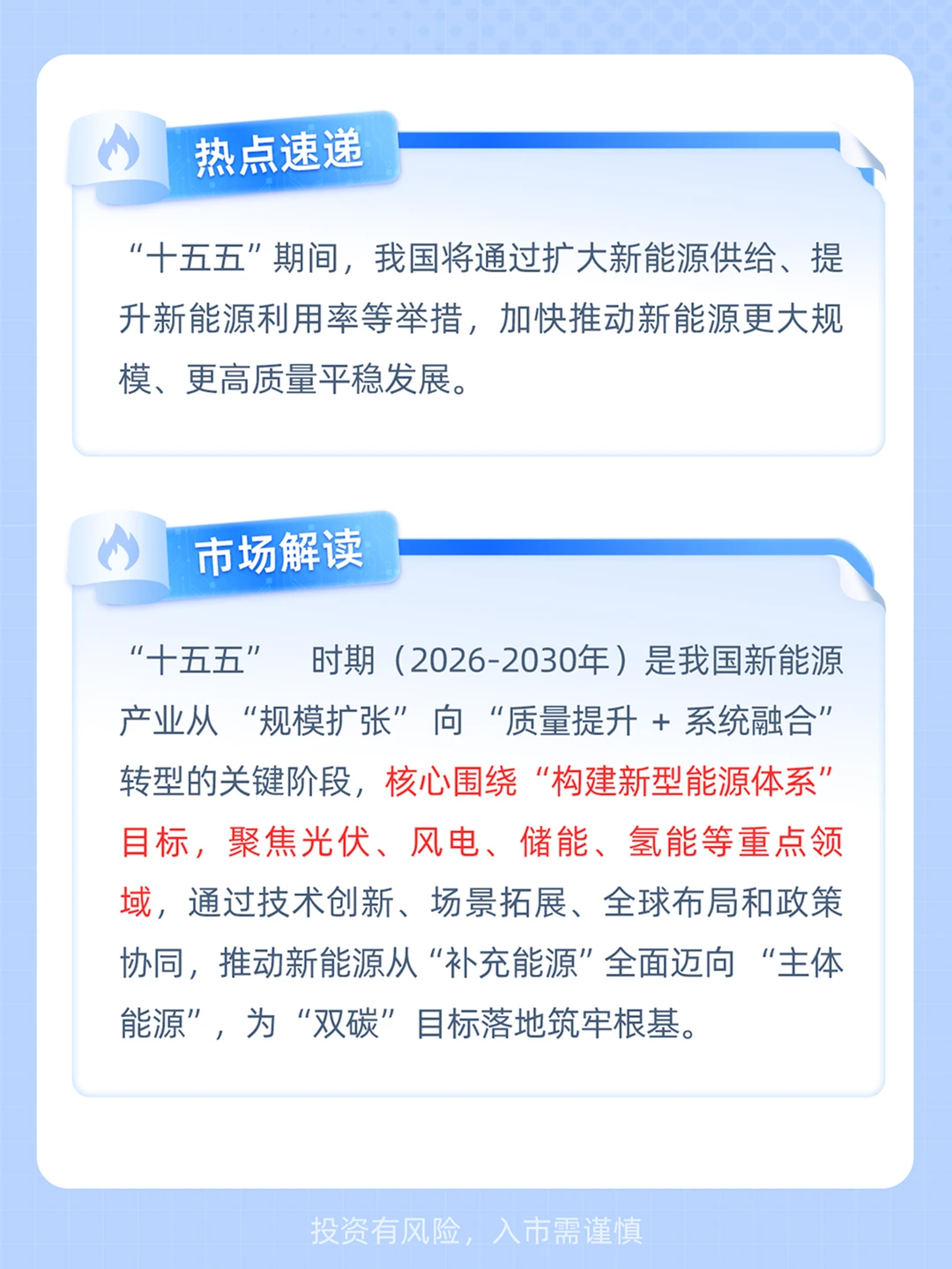 📖热点速递 🌟“十五五”期间,我国将通过扩大新能源供给、提升新能源利用率等举措,加快推动新能源更大规模、更高质量平稳发展。 📝市场解读 🌟“十五五” 时期(2026-2030年)是我国新能源产业从 “规模扩张” 向 “质量提升 + 系统融合” 转型的关键阶段, 🔋核心围绕 “构建新型能源体系” 目标,聚焦光伏、风电、储能、氢能等重点领域,通过技术创新、场景拓展、全球布局和政策协同, ⚡️推动新能源从“补充能源”全面迈向 “主体能源”, 🎯为 “双碳” 目标落地筑牢根基。