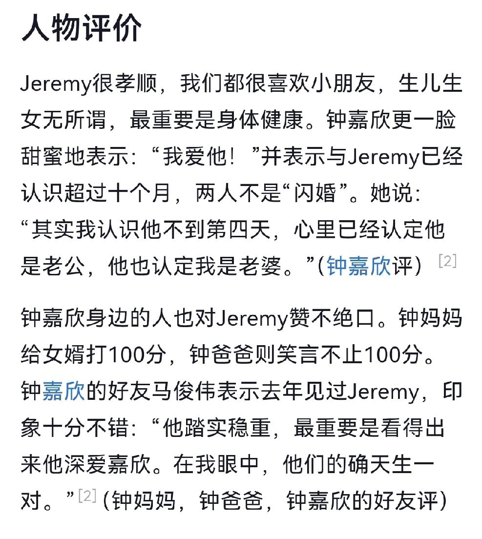 太讽刺了,这就是他人口中老实本分, 踏实稳重的钟嘉欣老公Jeremy, 不过好歹人家是个瘦死的骆驼比马大的富二代。 可惜的是,强而不自知的钟嘉欣没有看清自己, 明明自己已经是女明星了, 却因为穷困潦倒的童年经历, 选择委曲求全,生吞这碗夹生饭, 结果到头来一场空, 钱和小孩全都拿不回来, 成了单纯的生育工具,图啥? 真是幸福的童年治愈一生, 不幸的童年需要一生治愈。
