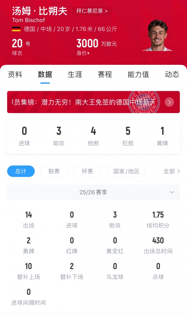 比朔夫今夏加盟拜仁,本赛季已为拜仁出场14次,贡献3次助攻,他在孔帕尼手下有时客串左后卫位置,也有亮眼的表现,他现身价3000万欧。