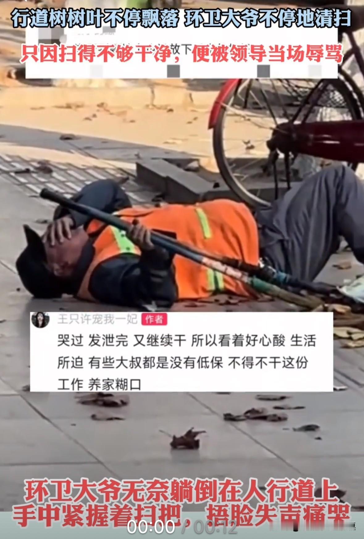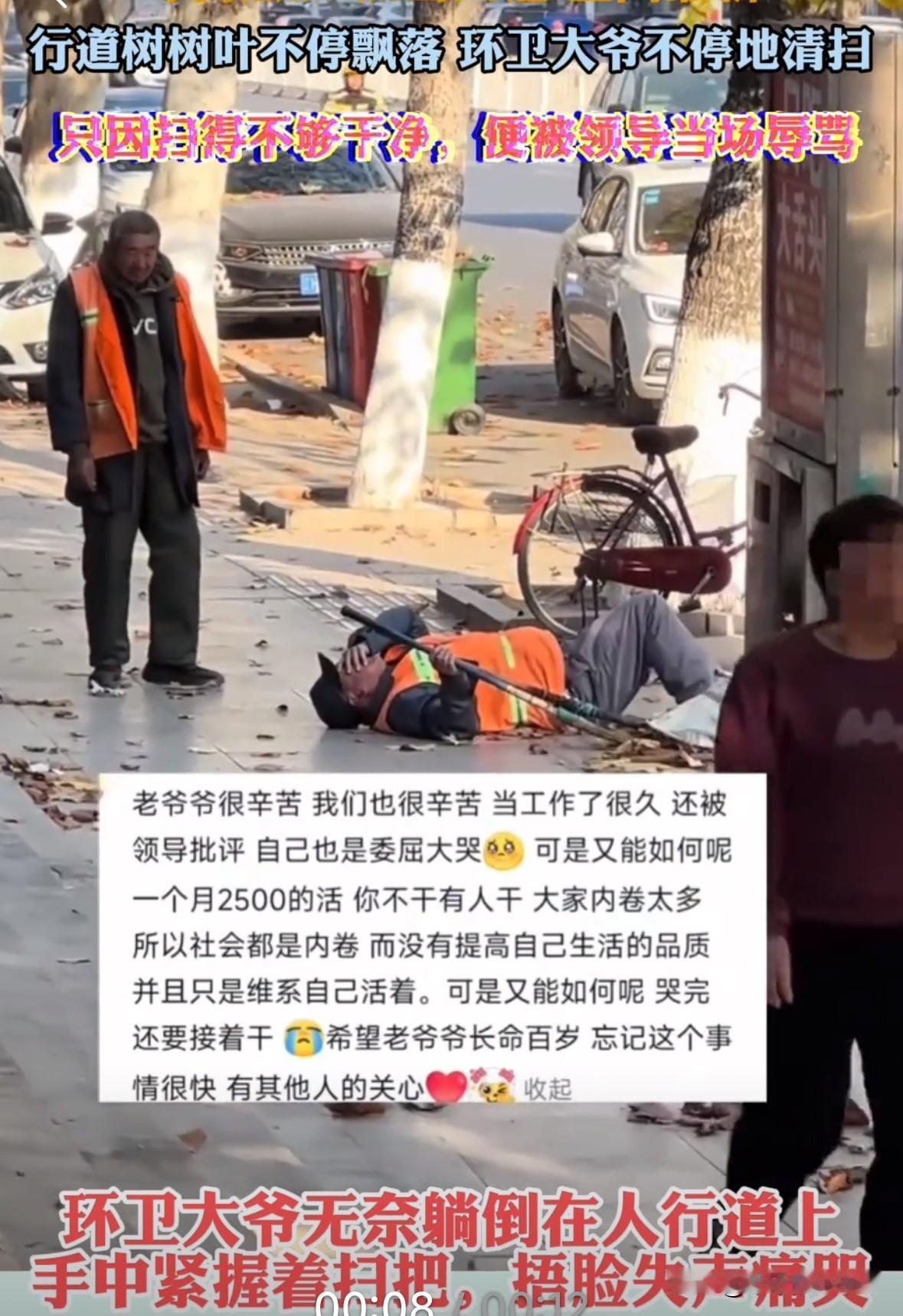 环卫大爷在路上扫落叶,由于落叶不停的落下来,大爷扫过后又落了一片。 领导过来,不分青红皂白把大爷数落了一顿, 指责大爷没有尽职尽责,落叶都打扫不干净! 领导走后,大爷情绪崩溃,躺在地上崩溃捂脸大哭,但是手里依然紧紧的抓着扫把! 都是混口饭吃,有必要这样故意为难人吗!初冬本来就是树叶飘落的季节,谁能控制? 像大爷这种人都是没有退休金的,他们都在努力的养家糊口,况且一直在扫地,根本没偷懒。环卫工 街道清洁工