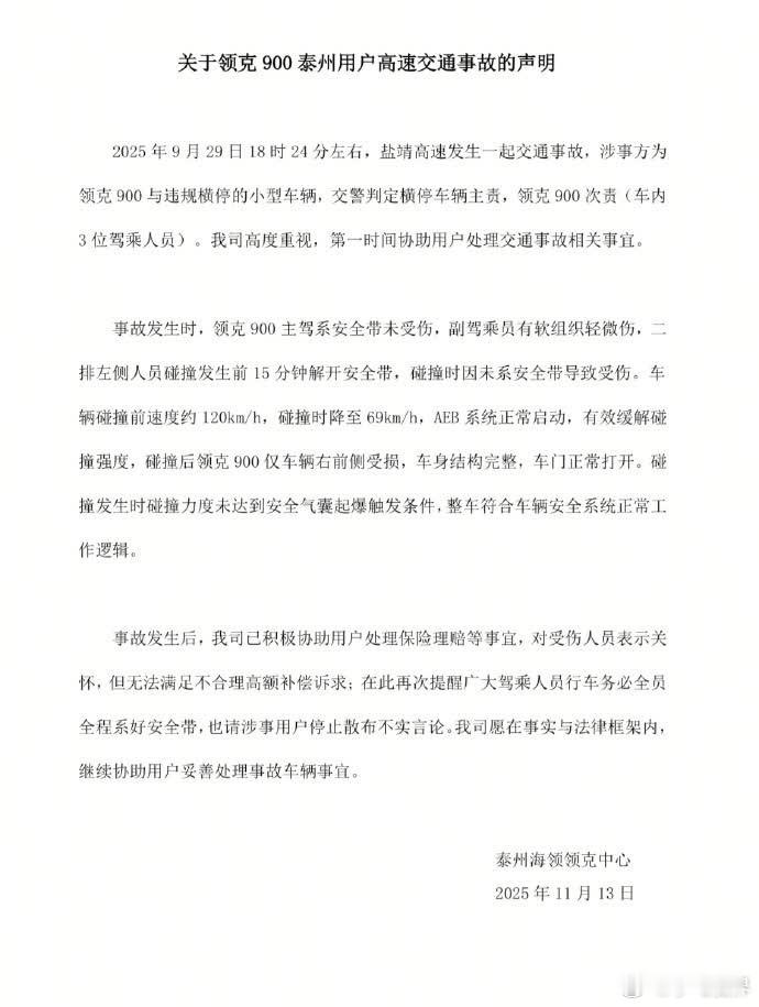 官方回应“领克 900 事故致乘客九级伤残”:后排未系安全带给我们提了个醒:再好的车,安全保护的第一步永远是那根安全带