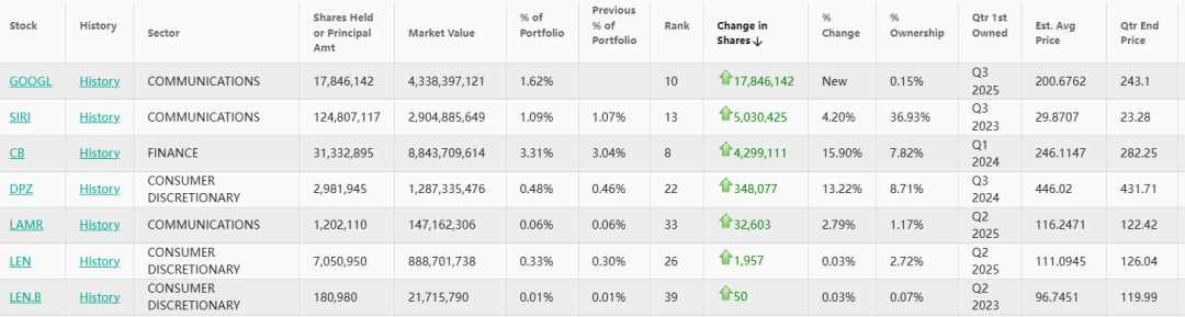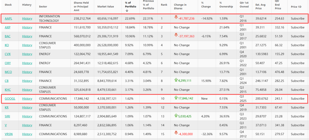 无论是从持仓市值变化还是从持仓占比的变化来看,Alphabet都是伯克希尔三季度买入最多的个股。有分析认为,建仓Alphabet可能是由伯克希尔的投资经理ToddCombs或TedWeschler进行的,这两人此前在科技股领域更为活跃。