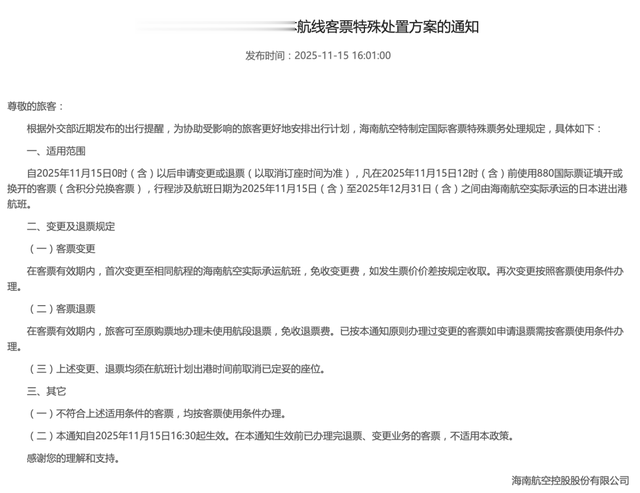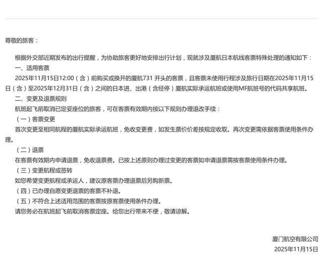 15日,国航、南航、厦航、东航、海航、川航等航司相继发布通知,对于出行日期在12月31日之前,涉及日本相关航线且符合相关条件的客票,可予以免费退改处理。