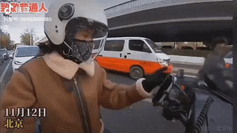 北京,一女子骑着摩托车在等红绿灯时播放音乐,男子突然上前请求女子播放一首《平凡日