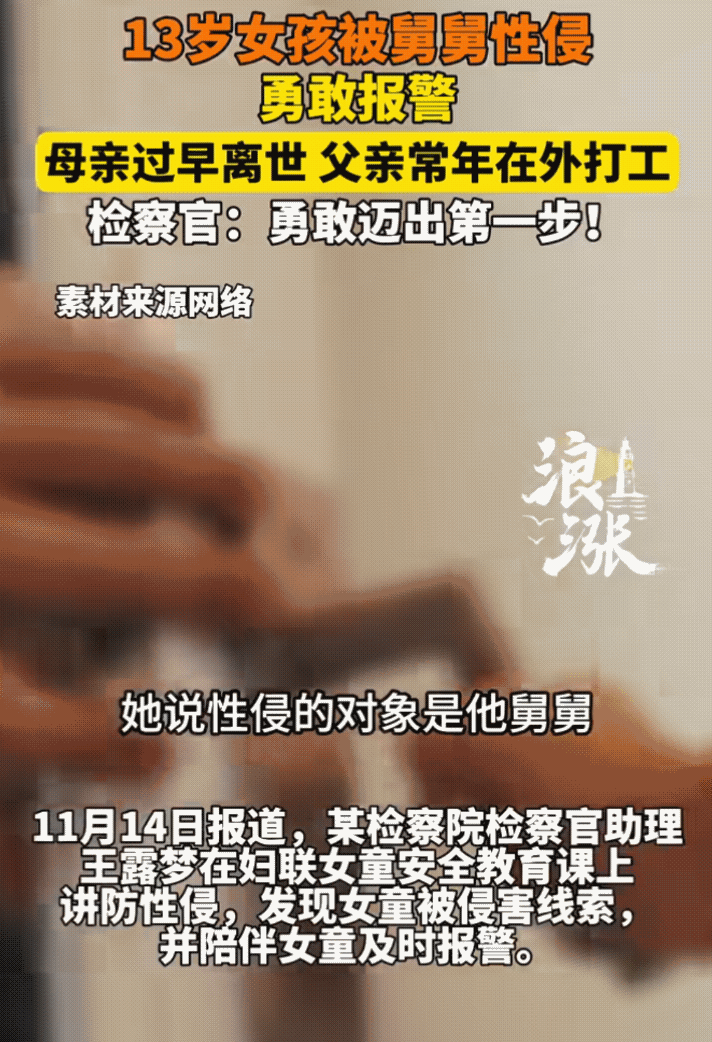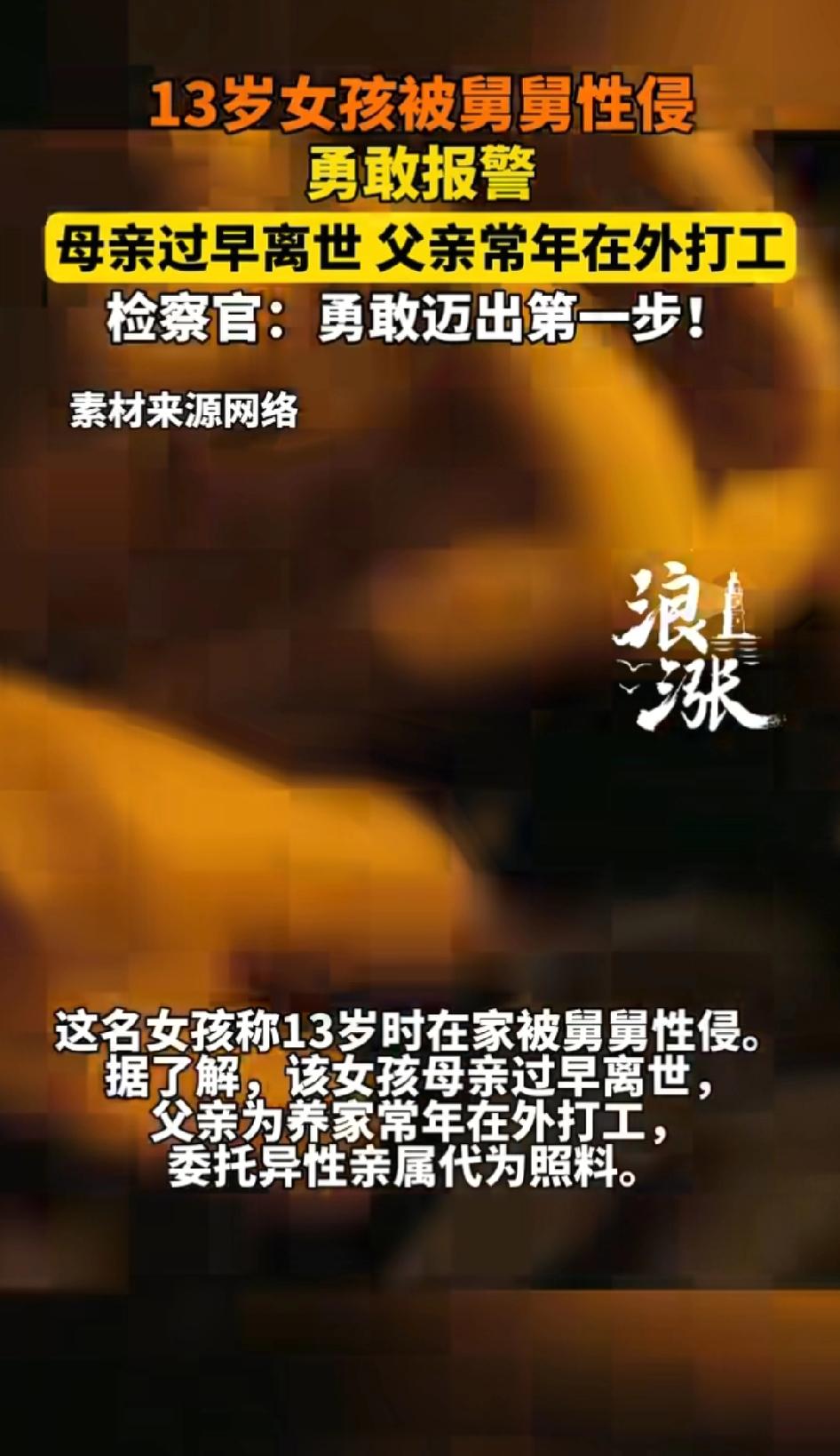 母亲过早离世,父亲常年外出打工,13岁女孩被舅舅性侵。检察官:勇敢迈出第一步 。 女孩被舅舅性侵,勇敢报警 。检察官助理在妇联女童安全教育课上讲防性侵,发现女童被侵害线索 ,随后陪伴女童报警。 母亲过世早,父亲在外打工。女孩被寄托在亲戚家照顾 。此事引起网友热议,有网友说:“有闺女真是要防一切异性,直到她有自保能力。” 父母一定要教育好自己的女儿,懂得保护自己 ,与异性接触时要保持距离 。最好有家人的陪伴 。 同时也要做好防性侵教育 ,不管男孩女孩都要懂得保护自己 。遇到了不法侵害,一定要及时报警,让坏人得到惩罚 。 对此事你有什么看法 ? 晒图笔记大赛 (信息来源:浪涨新闻 )