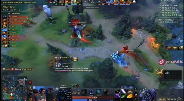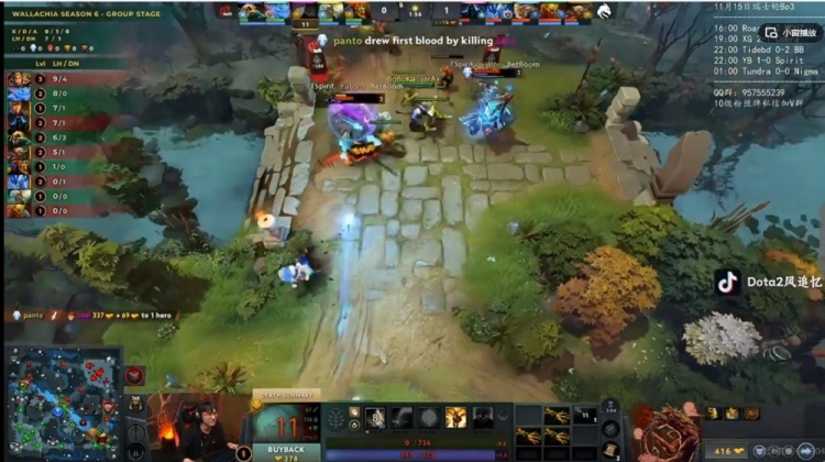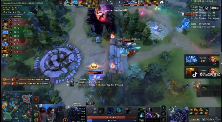 [6分钟]Larl大圣包下越塔强杀flyfly哈斯卡,直接传送门转上再杀zeal玛西,随后摆大配合队友抢掉了7分钟经验符!YB四人集火强杀大圣但是被他扳两个先反杀天命的蝙蝠,Yatoro亚巴顿给套子配合队友再反杀一个!