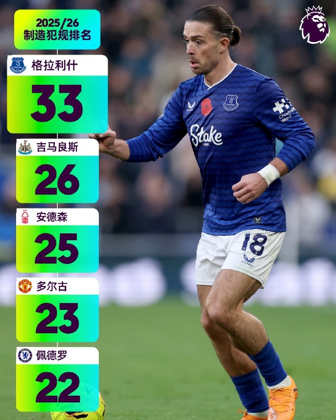 直播吧11月16日讯英超11轮过后,官方分享数据制造犯规排名,埃弗顿的格拉利什以33次高居榜首,吉马良斯和安德森分列二、三。