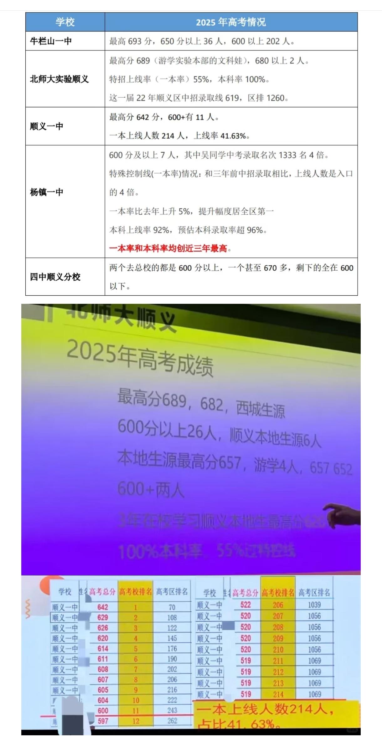 最高分689分,本科率100%,过特控线比例55%。这个是北师大实验顺义附属学校的首届高考成绩,看看符合你的预期吗? 根据学校数据,今年高考最高分689分,还有一个同学是682分,不过呢生源都是来自西城,在本部就读,学籍在实验顺义学校。 600分以上人数一共有26人,其中顺义本地生源6人,占比不多。顺义本地生源最高分为657分;去本部游学的有4人,成绩为657分和652分,还有两个600分以上,具体未知; 3年都在顺义后沙峪校区校学习的顺义本地生最高分为620分,上个211高校没问题。 三年前,也就是2022年北师大实验顺义的这拨孩子中招最低录取分数线为619分,全区最低排名1260名。当年,该校在顺义招生160人,还有在西城招生20人。西城的生源都在本部就读,只不过学籍挂在顺义这边。 总的来说,有惊喜但又没那么大,可能让有些满心期待的家长失望了。原先稳二追一,如今可能还要面临十一顺义的穷追猛赶。 顺便看下其他学校的高考成绩。