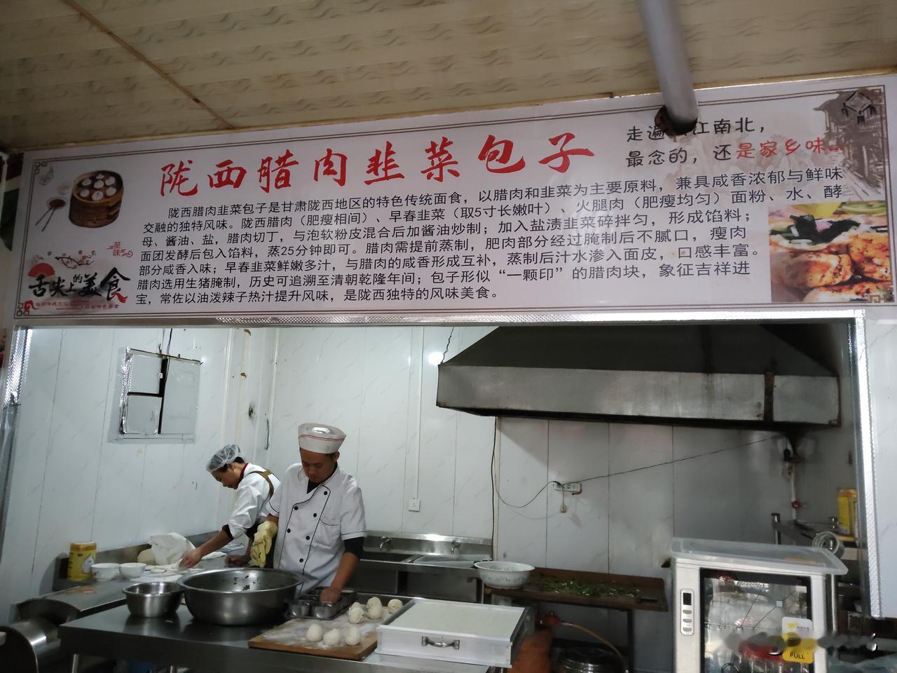 昨天在陇西火车站附近,吃了两个腊肉韭菜包子。 在旱码头文峰镇,啥都豪横。昨天,有点事去文峰,完了后来到火车站附近,准备坐公交回城,却在当街看到一个偌大的“腊肉韭菜包子”牌子,不由驻足。 要了两个腊肉韭菜包子,并吩咐不要摸猪油,我就坐在座位等待。只见女掌柜端来两个韭菜包子,冒着热气,同时也端来一碗冒着热气的姜汤。腊肉韭菜包子配姜汤,不知是啥时候的传统了。但这样的标配,在冬天是非常适宜的,因为吃喝全备,吃了暖和——这就是陇西的饮食文化,谁也说不清,就这么暖人。 吃完包子,喝完姜汤,我看后面一个偌大的牌子,就去拍摄。这时,我才看见后厨里两个收拾得非常干散的小伙正在包包子。令我敬佩的是,他们两个都是正规厨师的打扮,白帽子、白衣服,干净利落,一尘不染。这又刷新了我的认知:以前,我总是以为市井之地脏乱差,不料,在这人多嘈杂的市井里,竟藏着这么讲究的人。就为了两块钱一个的腊肉韭菜包子,他们竟做得如此认真。这两个小伙子,前途无量啊。