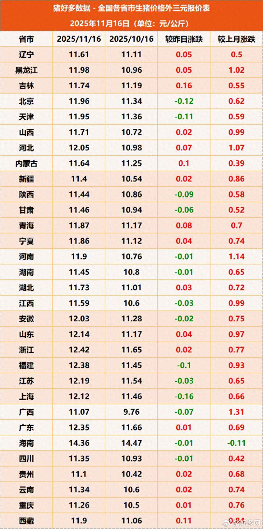 在当前猪市供需双增的情况下,市场供需博弈进一步加深,反映到猪价具体走势上,生猪行情持续的磨底震荡。值得关注的是,今日猪价止跌企稳,东北、西北全域飘红,不过猪价上涨动力略显不足的迹象还是比较明显,单日反弹幅度大部分在0.10元/公斤以内。