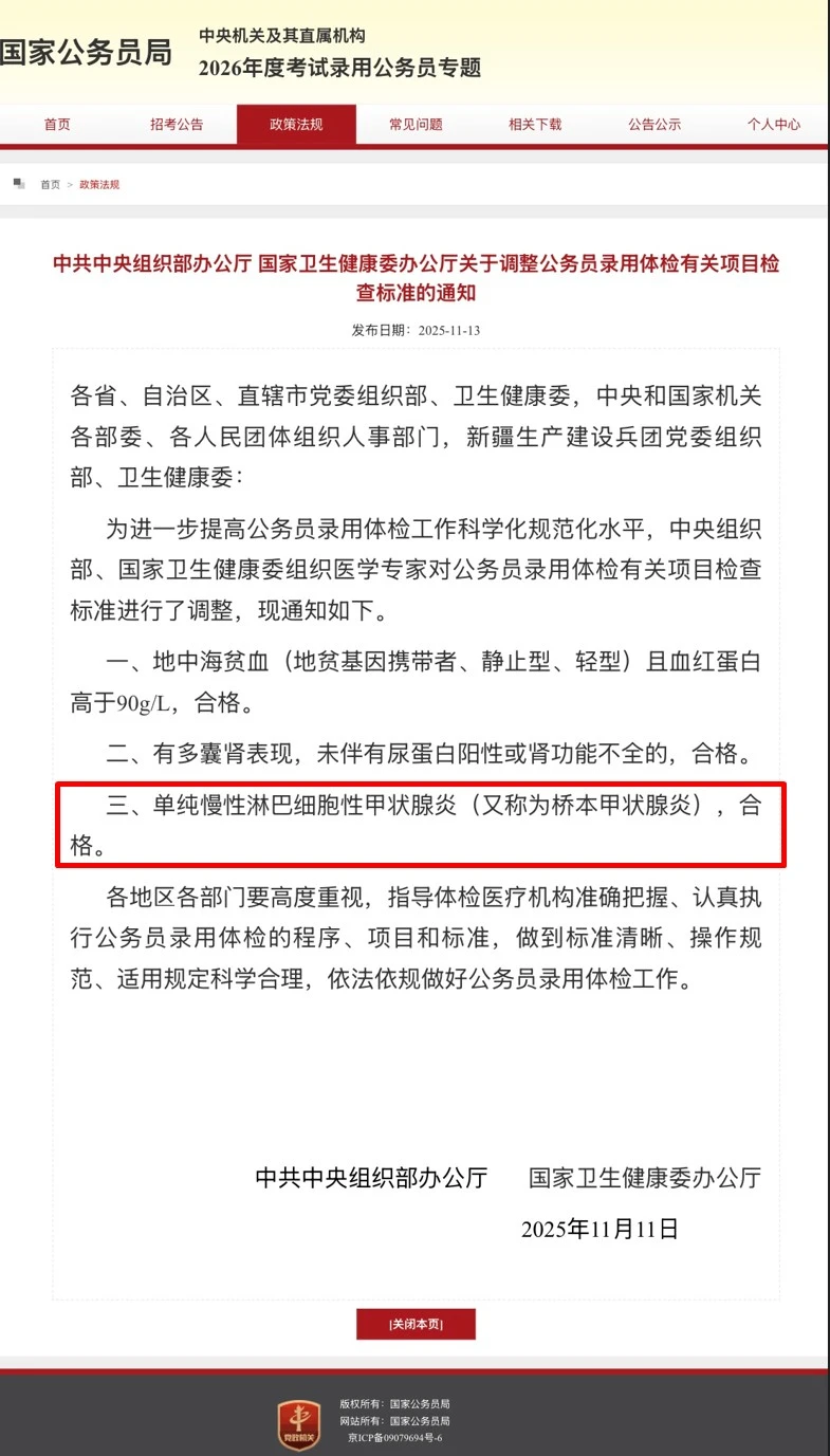 组织部与国家卫生健康委办公厅已于2025年11月14日联合发布通知,对公务员录用体检标准进行了调整,通知中清晰地列出了此次调整中与桥本甲状腺炎相关的具体规定: