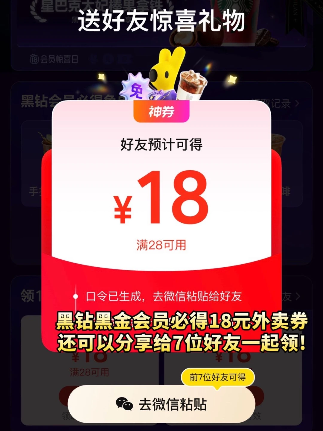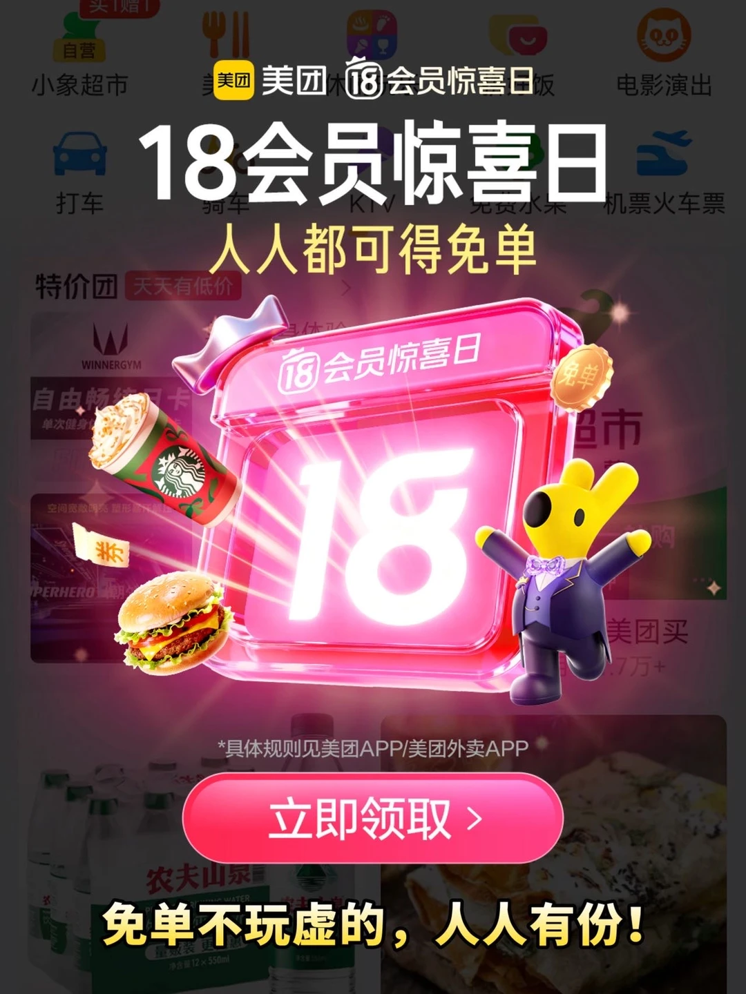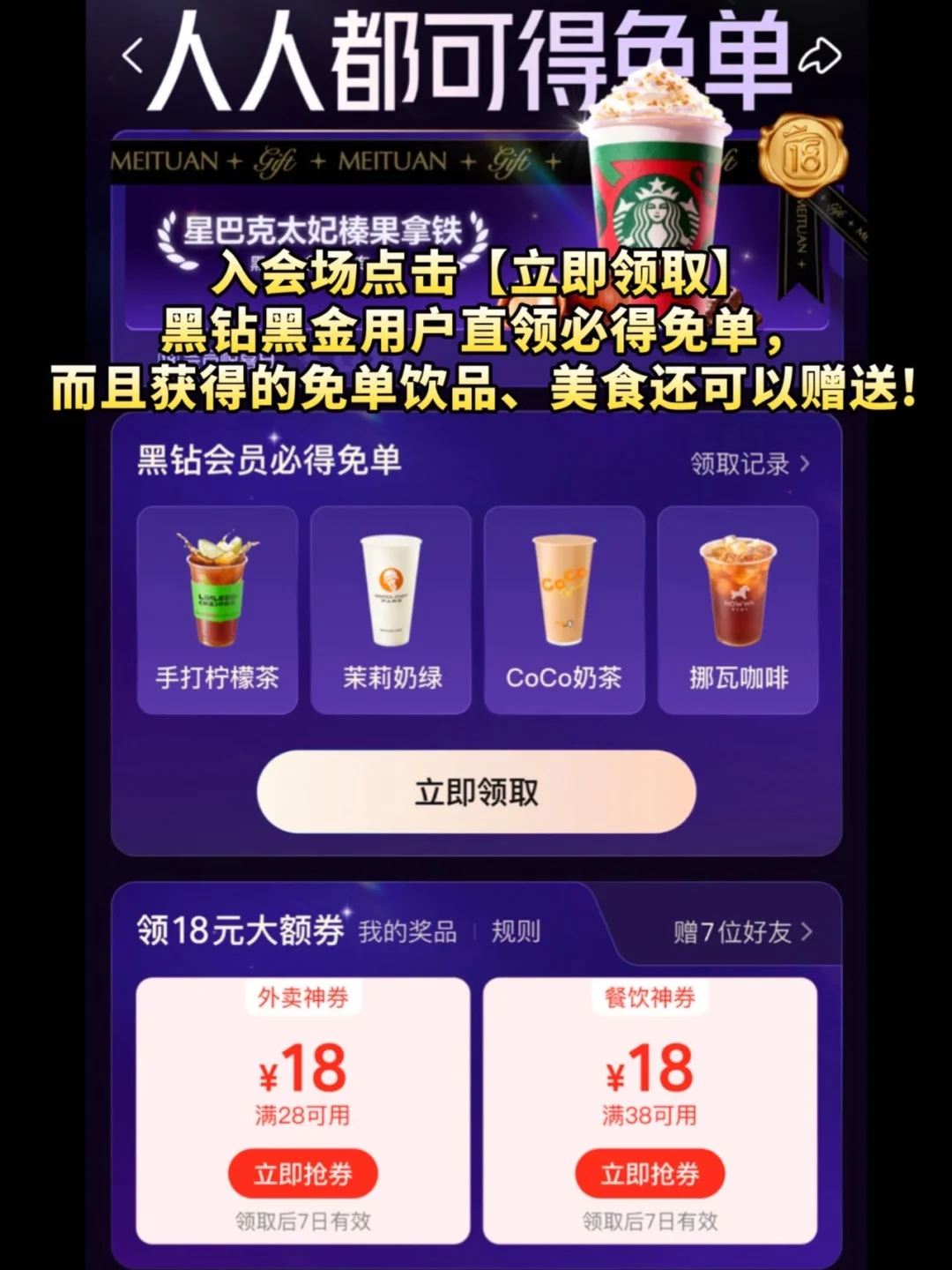 家人们谁懂啊!美团可以0元喝星巴克太妃榛果拿铁了!! 重点是不玩虚的!人人有份!操作很简单! 打开美团App搜【我要免单035】就能冲~ 黑钻/黑金会员直接领免单券,星巴克、沪上阿姨等大牌随便兑,还能送朋友一起喝;普通会员外卖累计满100r也能薅免单品一份,点两顿工作餐就达标~ 还有隐藏福利!黑金黑钻会员必得18元外卖券,还能喊7个闺蜜一起蹭,每人都有份都是18元外卖券~其他会员也有机会领取18元券,圣诞第一杯热饮直接让美团包了,快冲! 更多美团会员福利见