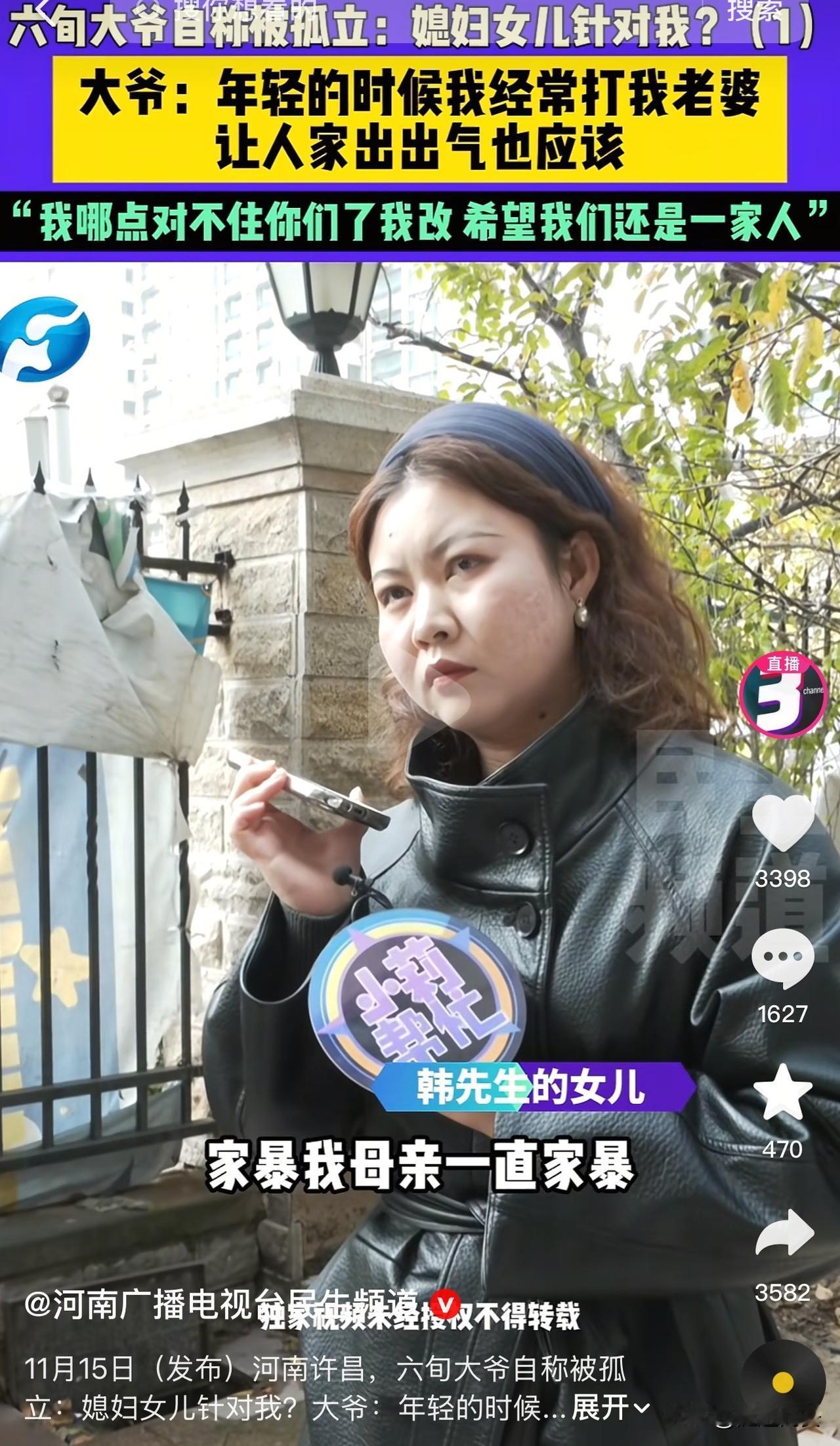 河南许昌,一大爷称因和老伴拌了两句嘴,老伴直接打他脸,随后把他送到了敬老院,经常给不够生活费,他给老伴打电话询问,对方却诅咒他早就该死了。更令人想不到的是,他的女儿拿着棒球棍直接把他轮椅给砸了…… 许大爷今年60多岁了,去年4月份,因为和老伴拌了几句嘴,他老伴就当着众多人的面,对他的脸左右开弓。 一周以后,他就被送到了敬老院,2200元的退休金也被老伴把持着,刚开始第一个月还给他600块的生活费,第二个月直接锐减成300块钱。 许大爷气不过,打电话质问老伴,钱给这么少,是不是想把自己给气死? 老伴轻飘飘的来一句,你早就该死了。 这口气他还没咽下去,让他更崩溃的是,不久后,她的亲闺女和老伴来到敬老院,二话没说拿起棒球棍就把他的轮椅给砸了,事后,他闺女撂下狠话“不准在骚扰她妈妈,否则就对他不客气”! 家人的行为让他伤透了心,他不明白自己哪里对不住她们,也期望家人能告诉他,他可以改正,还是希望和她们母女能做亲亲热热的一家人,所以他找到记者能帮忙调解一下。 记者也打着“说合不说分”的思想,相劝劝她们母女,直到她听到许大爷闺女说的那番话,她直接打消了那个念头。 许女士开门见山的说,但凡是一个讲道理的人,都不可能等到一个人60岁的时候,我们才不管他,他之前肯定是做了非常多过分的事情,让人忍无可忍了。 原来,在她很小能记事的时候,她父亲一直家暴她母亲,喝醉酒了直接拿着酒瓶子,往她母亲头上摔,拳打脚踢更是家常便饭。 有时候她父亲给她打电话,扬言不仅要弄死她妈,还得把你也弄死…… 她时常在想母亲的命为什么这么苦,母亲为什么找一个这样的老公?自己上辈子究竟做了什么孽,这辈子怎么会有这样的一个父亲? 她仍记得和父亲最后一次见面,父亲拿着刀站起来,眼露凶光,一步一步往她身边走,许女士觉得必须让他们分开,自己要好好保护母亲。 从那后,许女士决定再也不管父亲了,他想咋样就咋样,就多大能力就翻多大天,自己不怕丢脸。 针对拿刀这件事,许大爷一点也不认为自己有错,解释称自己拿刀任何事也没有。 是啊,他或许就是吓唬一下她们母女,而在许女士眼里,拿刀走上她的那一刻,他就没把她当成女儿,倒像是一个仇人。 许大爷到最后也没想明白,他为何落了一个这样的下场。 俗话说,有因就有果! 他从没想过当他的每一个拳头、每一个巴掌、每一次的拳脚相加,对他老伴的伤害有多大。 到现在老了需要人照顾了,才想起自己的老婆孩子,还想道德绑架她们来伺候自己。 可是他有没有想过,当孩子需要一个情绪稳定的父亲,一个温暖和谐的家,他有做到吗? 节目的最后,他才认识到自己错了,保证不会打骂她们母女,可是伤害已然造成,并不会因为他轻飘飘的一句道歉,就会抹灭多年来对身体以及精神造成的创伤。