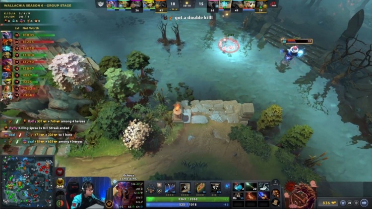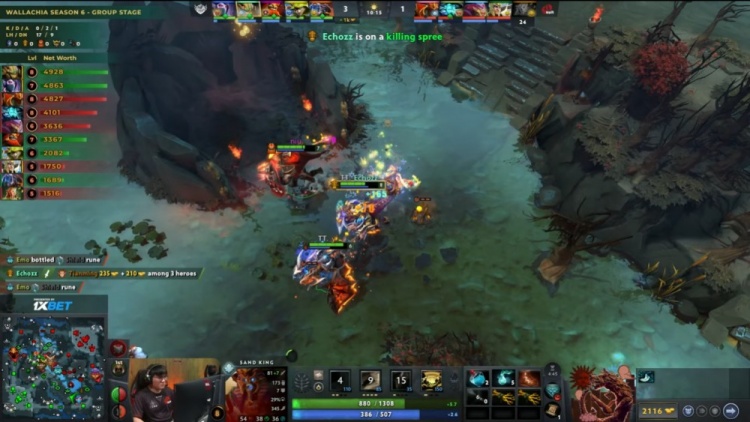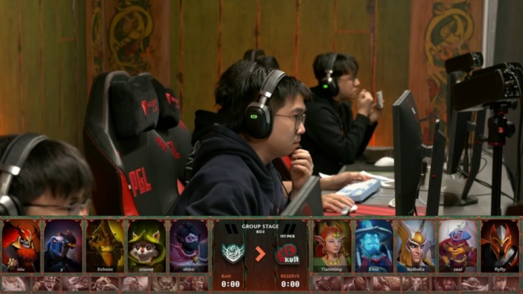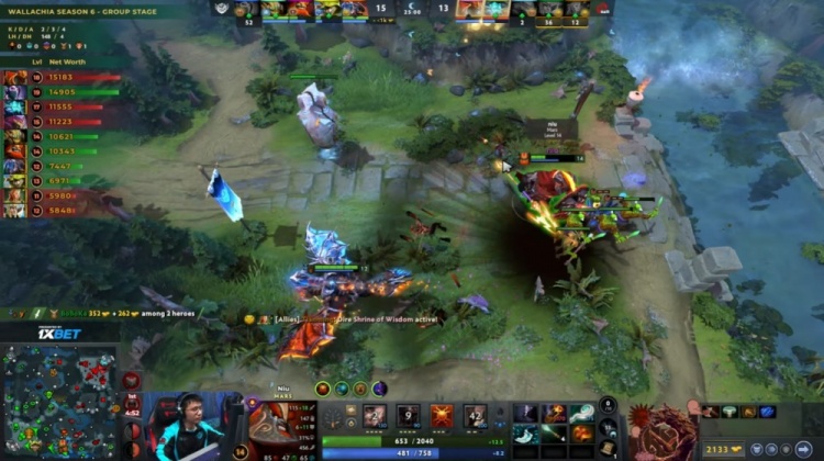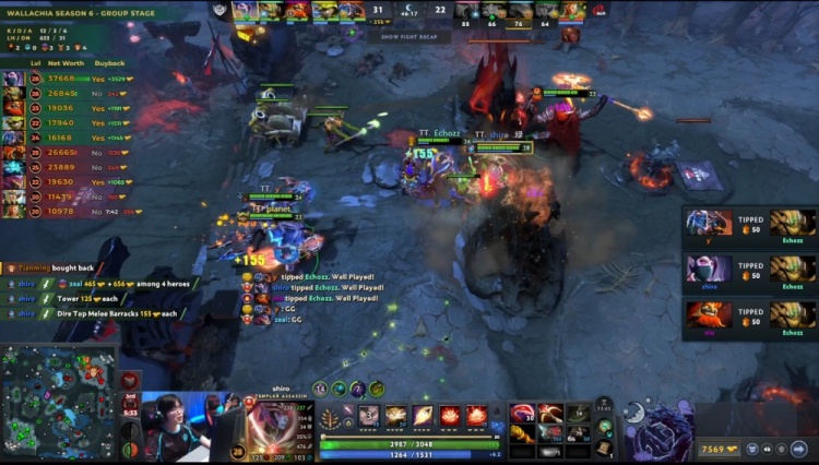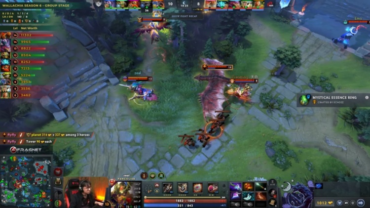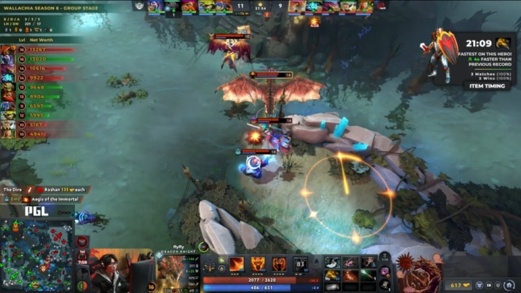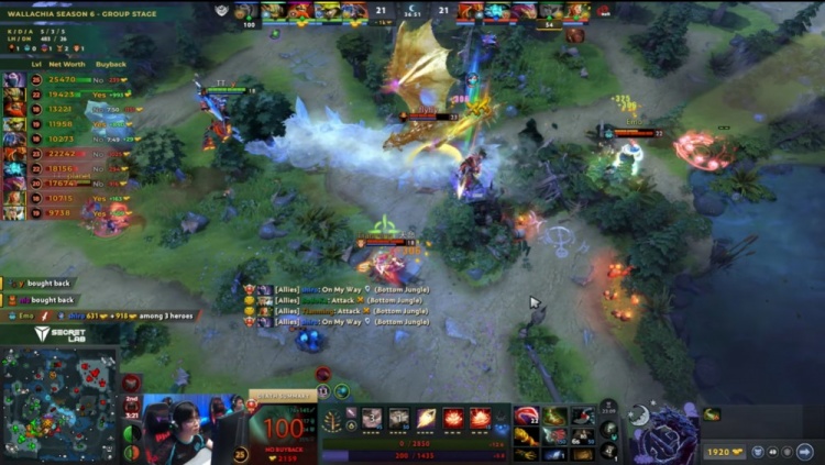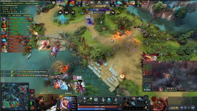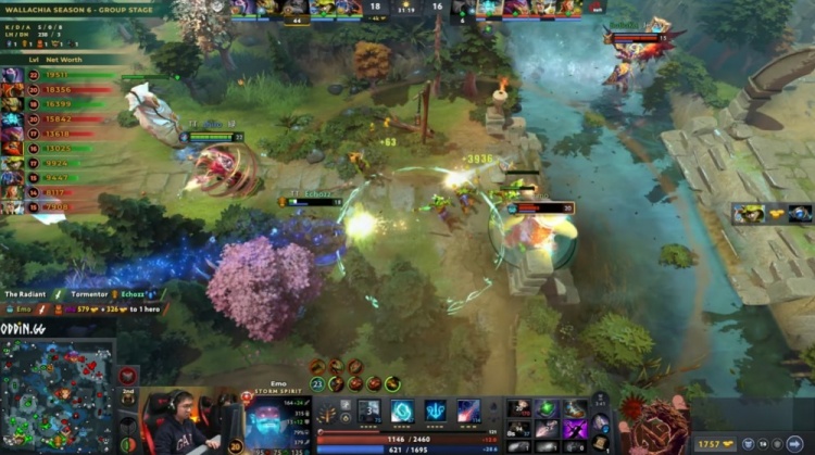 [23:52]下路团战,飞飞被双头龙板住开出BKB,玛尔斯开框住YB三人,sh1ro带走zeal,niu玛尔斯追击带走天命小鹿,下路继续开战,Emo蓝猫反杀sh1ro的TA,y补掉boboka,战车打出1换3,经济领先1k。