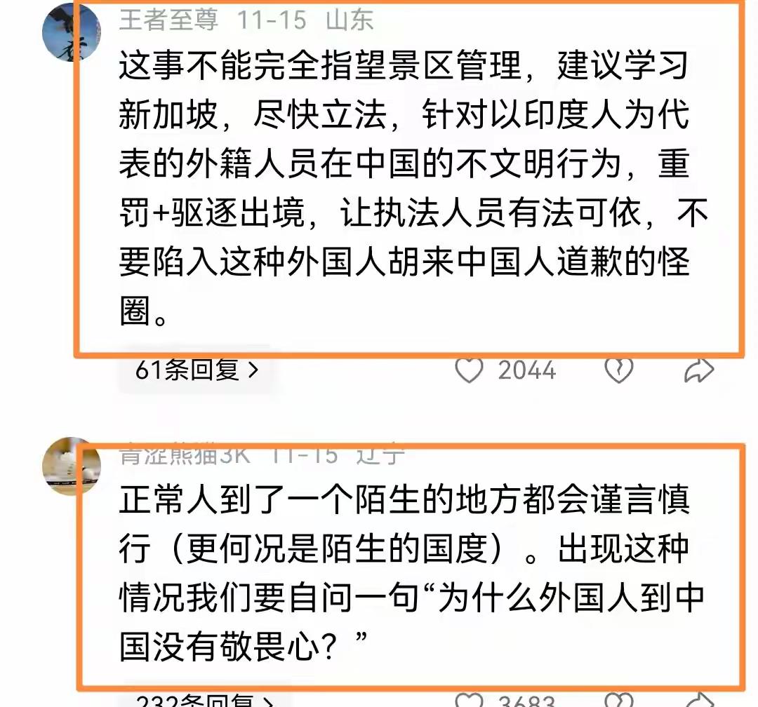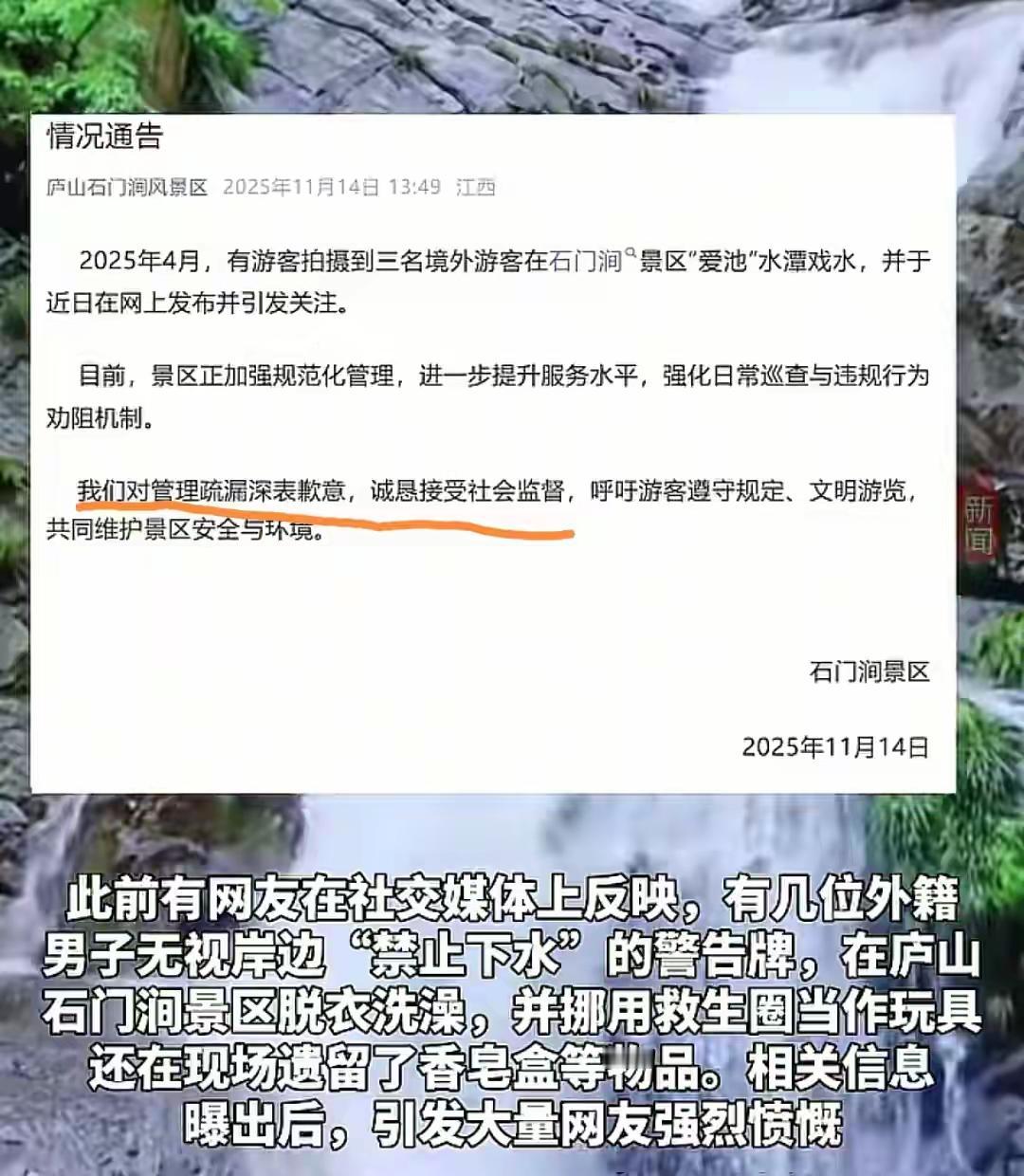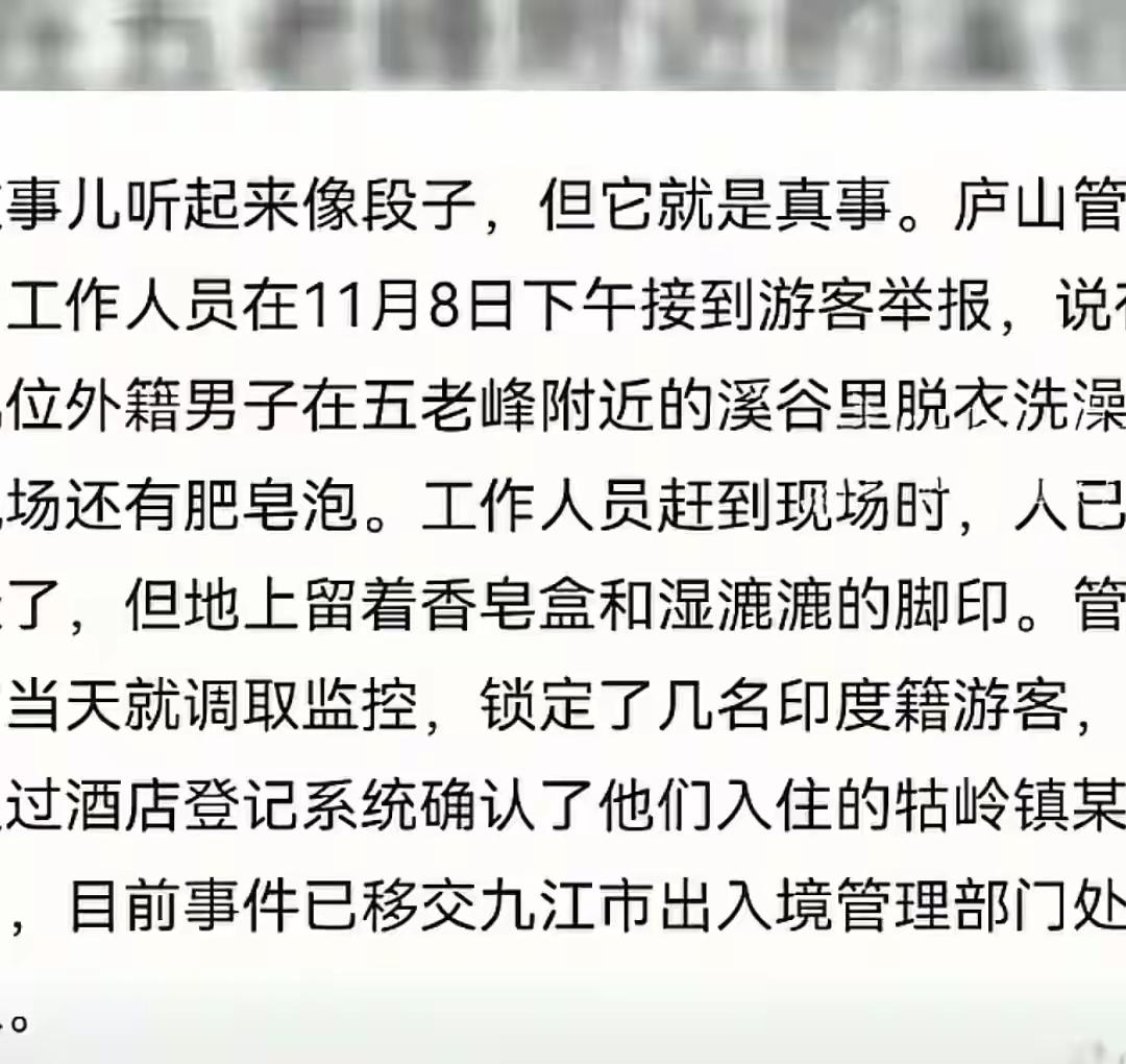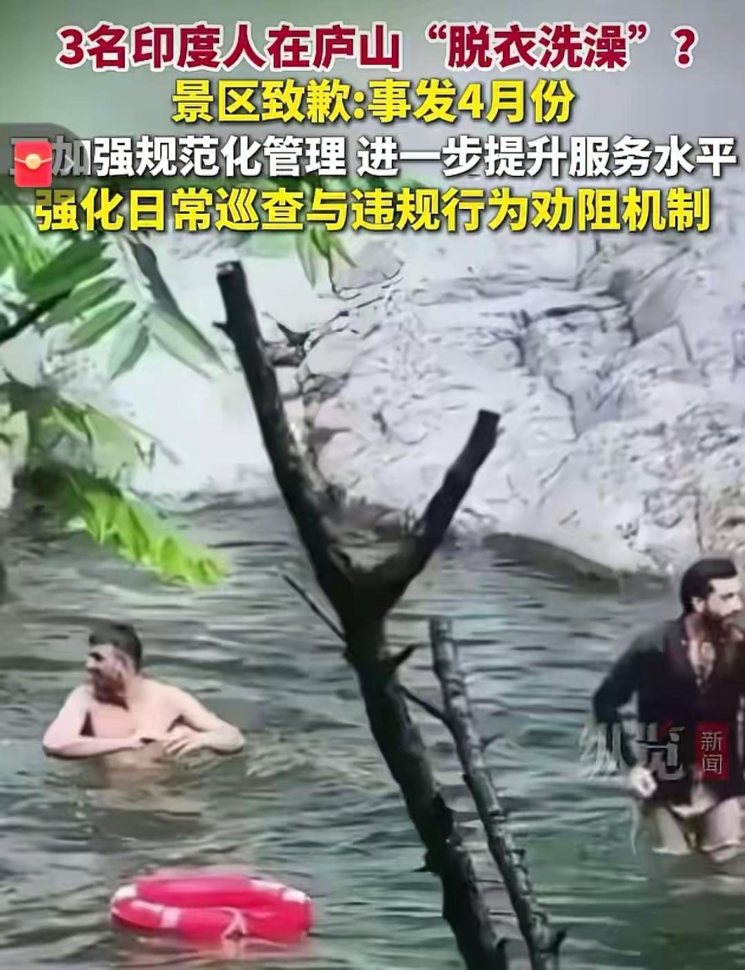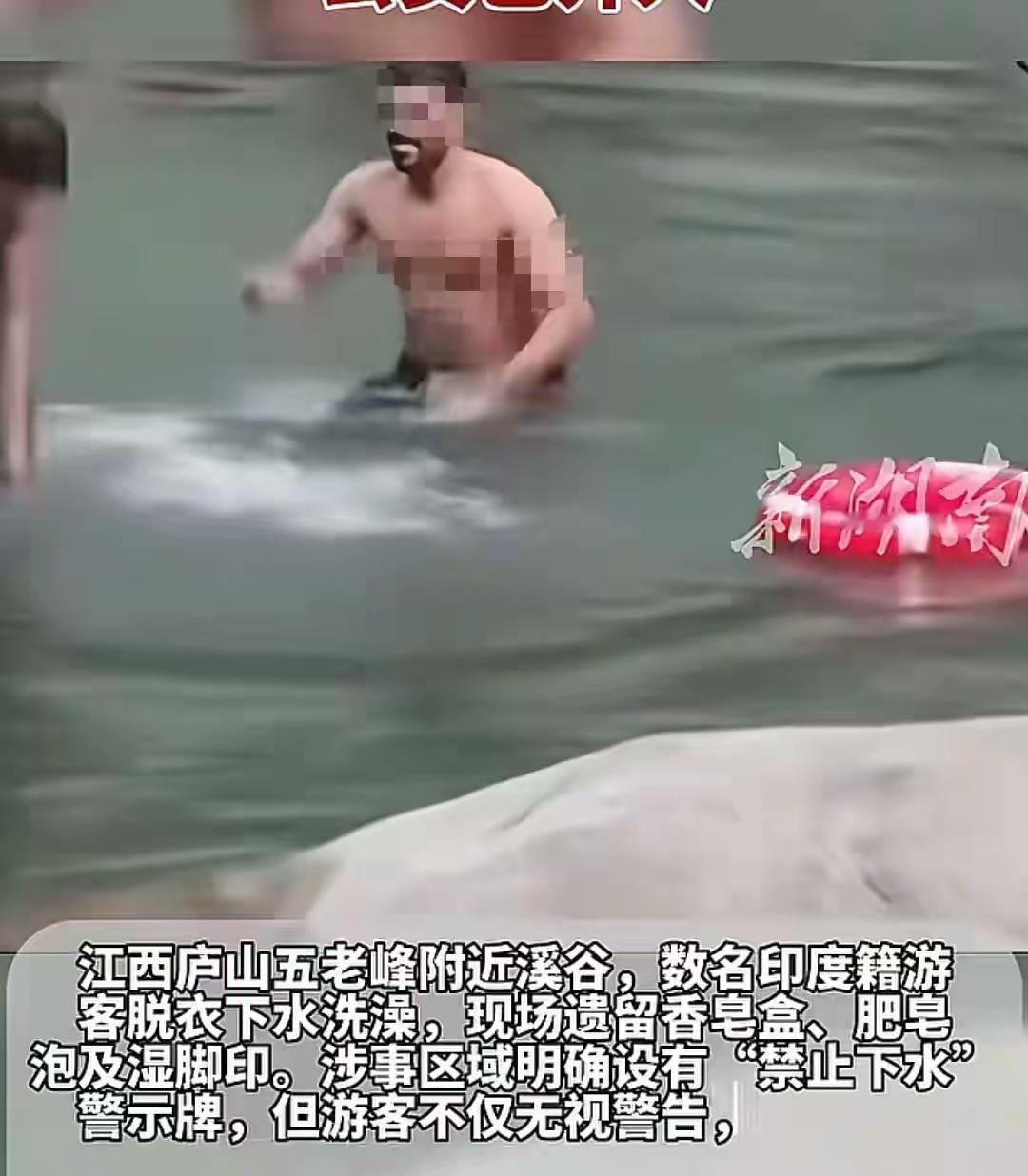 “溪谷当恒河!”庐山五老峰,三名印度游客脱衣跳溪洗澡,岸边肥皂盒摆一排,游客制止无效,工作人员到场人已溜,景区连夜发通报道歉,网友:跑得了人,跑不掉丢人! 今年4月,网友在五老峰溪谷拍到三名印度男子裸身沐浴,现场留香皂盒与救生圈,景区证实属实,已移交九江市出入境管理部门。 当时岸边游客多次劝阻,三人仍大笑戏水,直至听见保安对讲机响,才拎起衣物赤脚离开,全程被手机录下。 事后,庐山管理局发文承认巡查盲区,表示将增派队员、增设多语警示牌;涉事酒店通过入住系统锁定身份,案件正由出入境核查,是否处罚待通报。 网友盘点:北京亮马河、吉林松花江、武汉长江近期均现印度人下水画面;地铁里手抓饭、黄浦江丢垃圾,被拍到的只是冰山一角。 评论一边倒:国人出境谨小慎微,外籍人士来华却肆无忌惮,不是素质差异,是违规成本太低;呼吁立法重罚+驱逐,让执法者有法可依,别再让中国人为外国人的错误道歉。 对于这件事情,大家有什么看法?