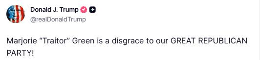 特朗普在社交平台“真实社交”账号发布攻击美国众议院乔治亚州第十四选区极右翼共和党众议员玛乔丽·泰勒·格林以及众议院肯塔基州第选区来自自由意志主义共和党众议员托马斯·马西的言论。 特朗普愤怒的将极右翼分子的马乔丽·泰勒·格林称之为“左翼”。。。特朗普声称: 泰勒·格林转向“左翼”出卖了所有共和党人。 特朗普:玛乔丽·“叛徒”·格林是我们伟大共和党的耻辱!