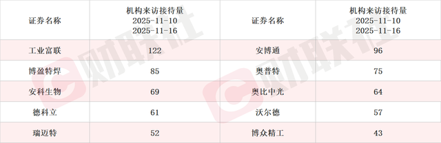 具体上市公司方面,据Choice数据统计,博盈特焊接受调研次数最多,达到5次。从机构来访接待量统计,工业富联、安博通和博盈特焊排名前三,机构来访接待量分别达122家、96家和85家。