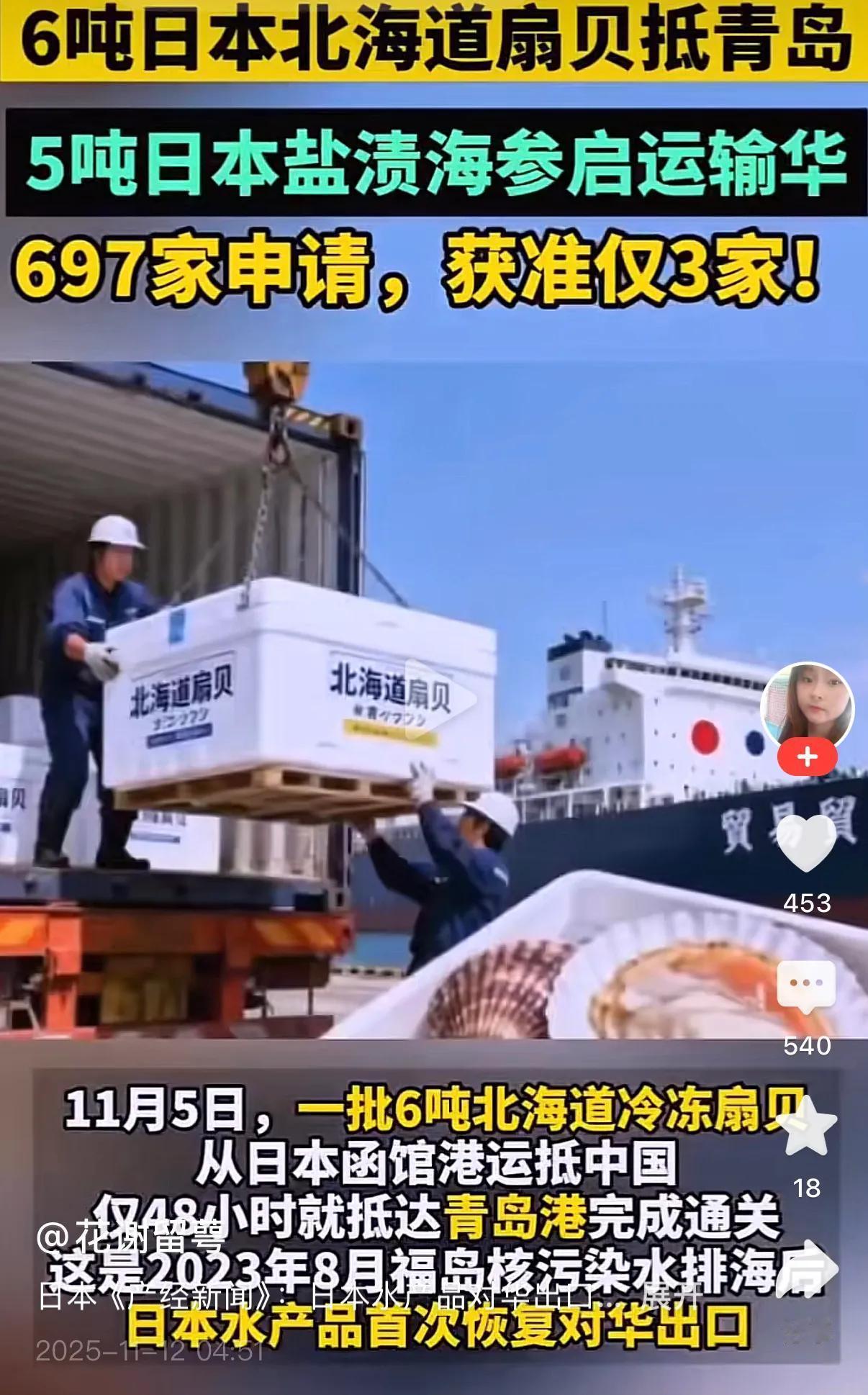 扇贝不能吃了,海参也快了,5吨盐渍海参装箱完成,正在来的路上,喜欢吃海参的朋友们,敢紧屯点吧!晚了只能望参兴叹了。不仅如此,他们还要求中国解除对日本其它10个都县水产品的进口限制,将各类水产品大量进入中国…不敢想,仅仅一种扇贝,渔民就叫苦连天了,卖不动了,其它日本海产品再进入海鲜市场,海鲜市场非凉不可,谁敢以身试核!
