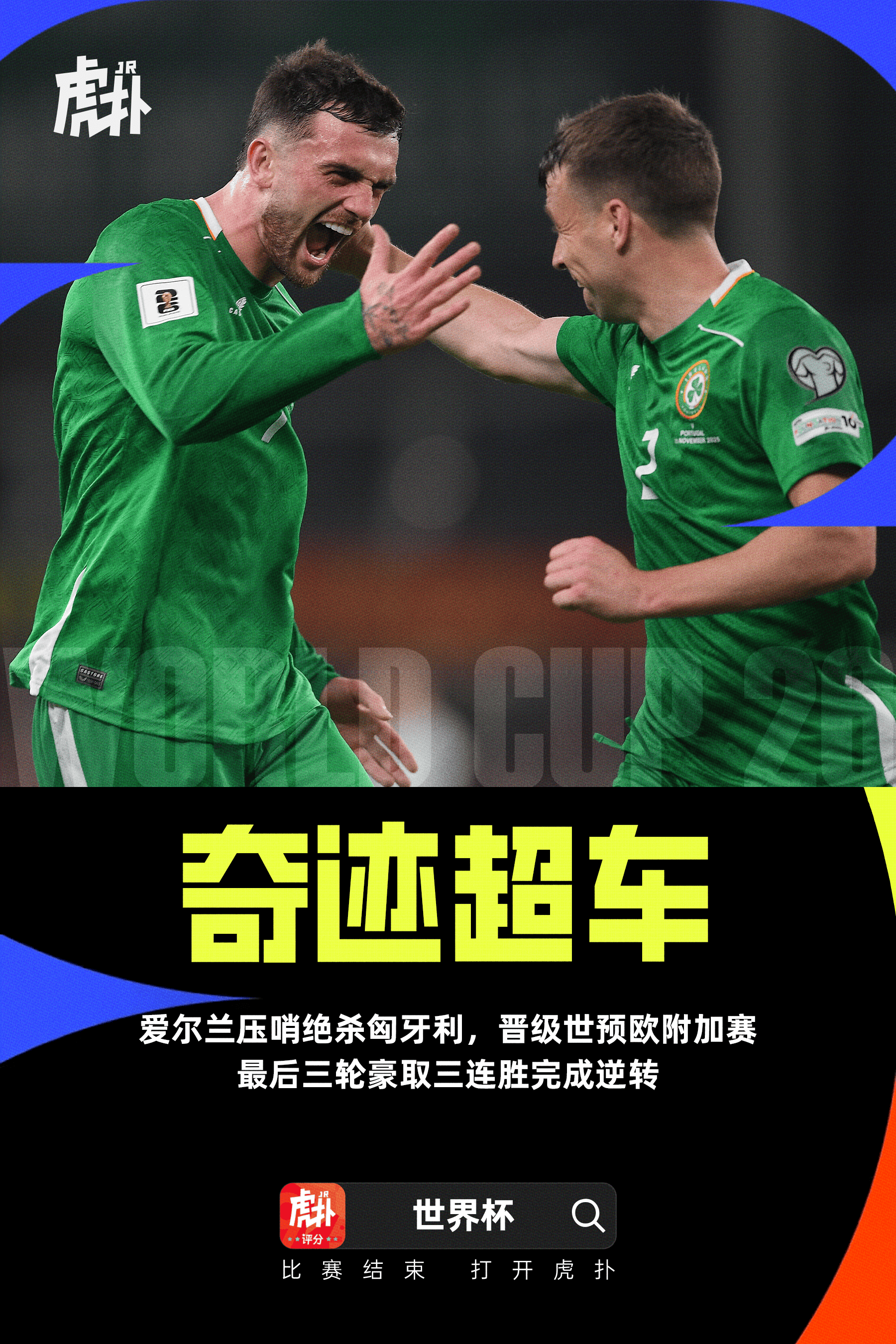 虎扑11月17日讯世界杯欧洲区预选赛,爱尔兰在最后一轮的伤停补时最后时刻绝杀,3-2击败匈牙利,反超对手晋级欧洲区附加赛。