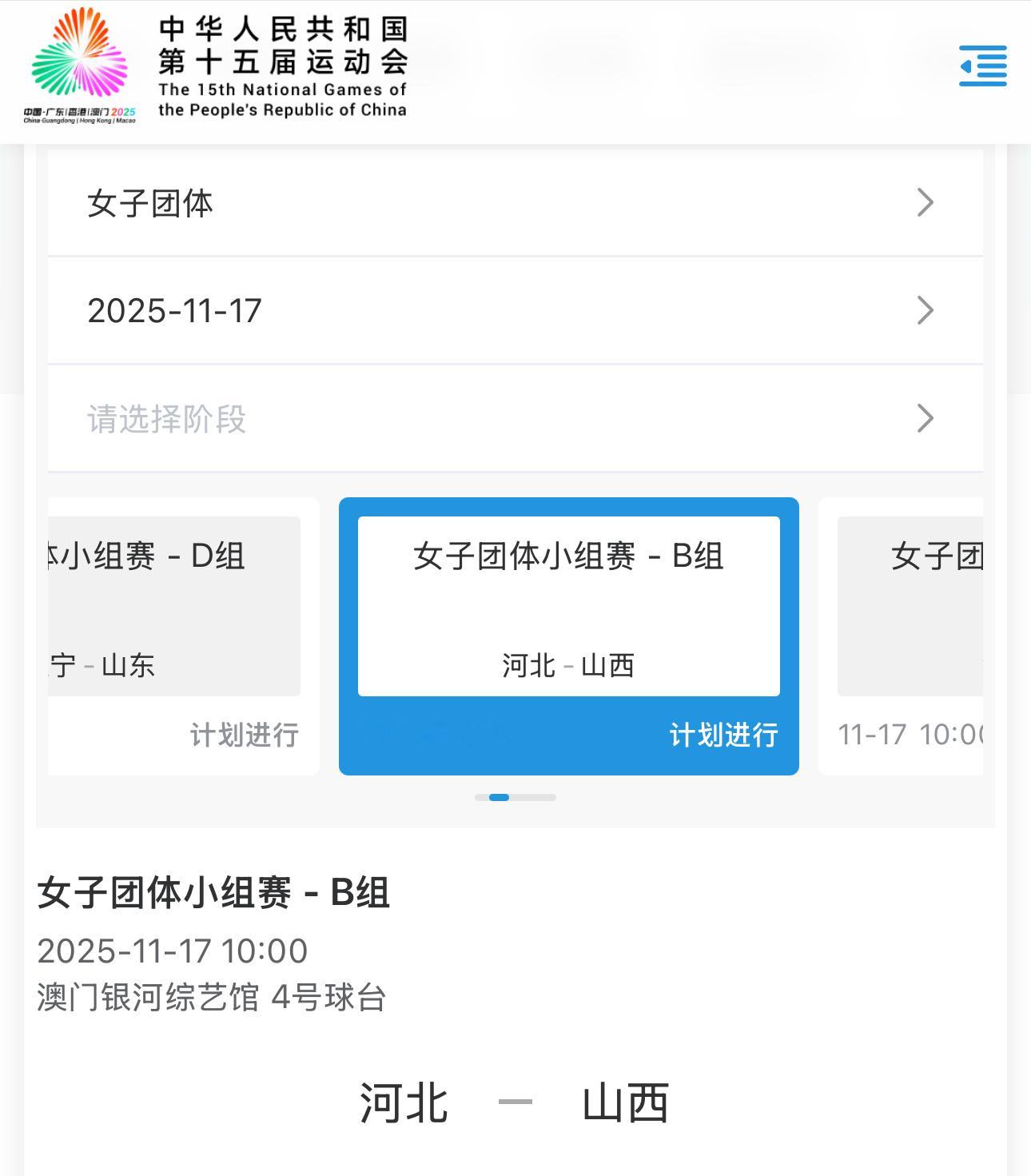 2025117|第十五届全运会赛程预告男团小组赛A组11月17日 10:00T1北京VS江苏女团小组赛B组11月17日 10:00T4河北VS山西