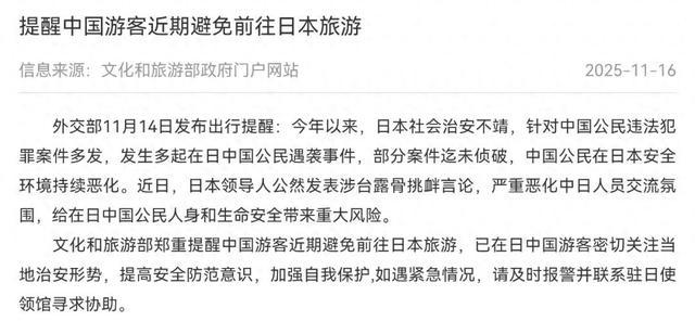 11月16日晚,文化和旅游部发文,提醒中国游客近期避免前往日本旅游。具体内容如下↓