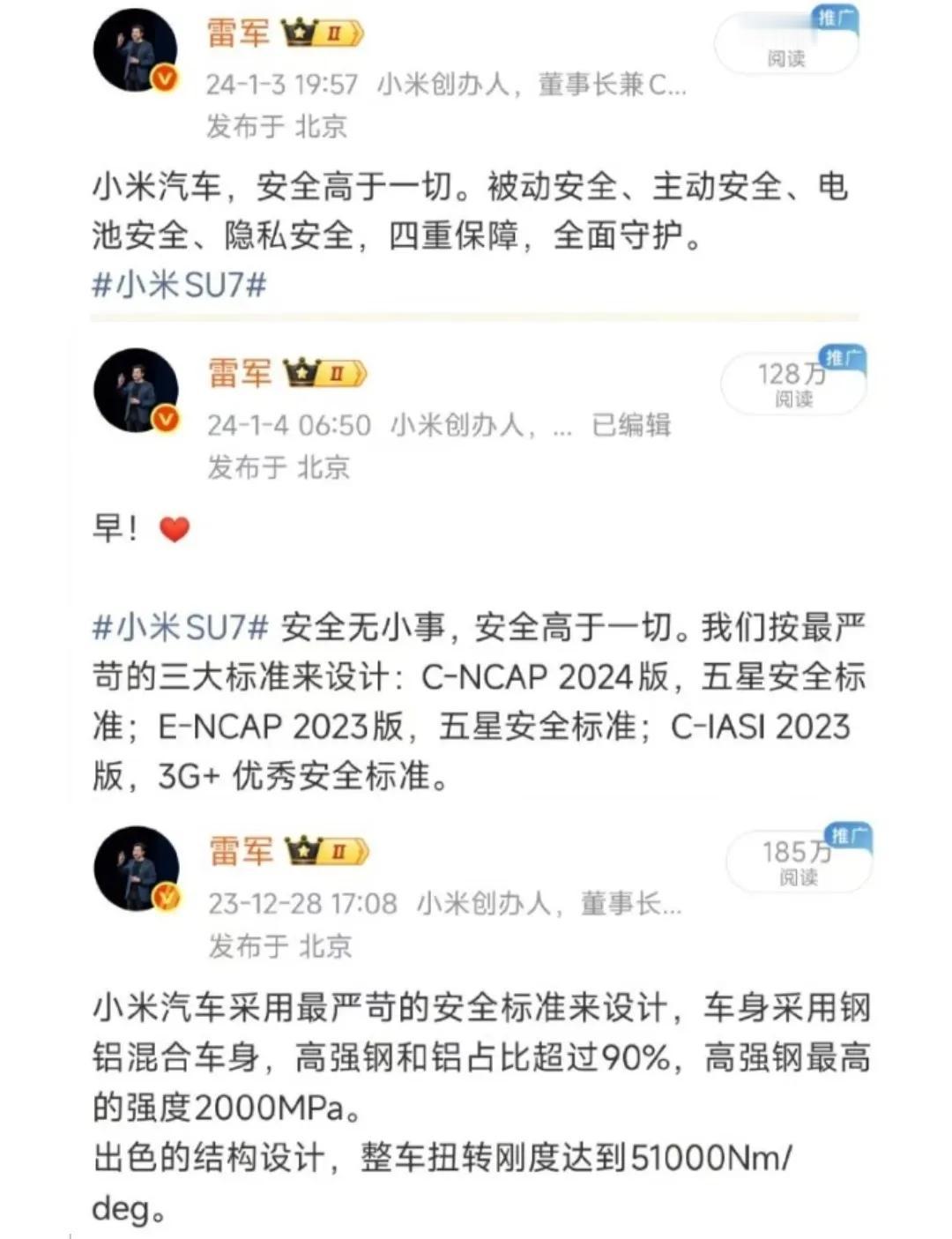 雷军真的怒了,开始强硬反击。面对小米汽车近日遭到不少网友质疑,尤其是连雷军造车的初衷都被挖出来攻击,雷军再也忍不了,一天之内多次发声,甚至不惜挖出自己几年前发的帖子自证清白,措辞十分强硬,一向温和的雷军实现压不住心中怒火。 雷军最忍不了的是,很多网友对他曾经说过的话故意断章取义,比如“一辆车,好看是第一位的”,就被一些别有用意的人当做是雷军造车的理念,好看比安全更重要。都知道抛开前提和语境谈大佬说的某一句话就是耍流氓,哪怕就是单独把这话拉出来,凡是脑子正常的人,都不会说出这种降智的话来。可以想见雷军看到有人故意找茬,会有多愤怒,不惜自己把当初说的话发的贴都拉出来自证清白,好看也得建立在安全的基础和前提之上,这一点都不矛盾。更何况雷军此前也多次强调“安全高于一切”,只可惜这些话被人直接忽略。 不可否认,雷军在小米SU7 特别是更贵的SU7 ultra宣发过程中,过度强调了小米汽车不输超跑的性能和体验,可若就此就下结论说,雷军本末倒置不把驾乘安全当回事,多少就有点小人之心度君子之腹了。你可以说雷军为了多卖车说安全的次数远没有漂亮参数多,但绝不能说雷军不重视安全。