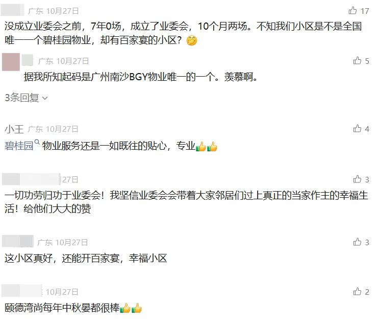 【碧桂园海湾一号换物业公司受阻】早前碧桂园海湾一号成立了业主委员会,之后火速发出选聘物业服务企业的公告。根据介绍本次海选共收到17家物业服务企业报名,其中10家物业服务企业资料齐全,审核通过; 3家物业服务企业待定,需补充资料复审;4家物业服务企业不符合报名要求,审核不通过。 正当大家都以为碧桂园海湾一号这次换物业稳了的时候,剧情反转!有多位业主在人民网平台投诉小区业委会,表示根本没走正规流程开业主大会,也没拿到业主们一起做的决定,就自己发了选(续)聘物业服务企业事宜的函和玺佩花园小区公开选聘物业服务企业报名公告,属于私自启动选物业公司的程序,损害了业主一起做决定的权利。甚至有部分还写明了“现在的物业现在做得也挺好的,什么不续签人家就要换其他的”,感觉这位业主真的有点此地无银的感觉。 有趣的是,就在小区要换物业之前,现在的旧物业突然还举行了两场百家宴来回馈业主,惹得南沙其他的小区都各种羡慕嫉妒恨。 大家说,这个事情是不是很有趣?联合起来看起来这个一波复制粘贴投诉就更有趣了。