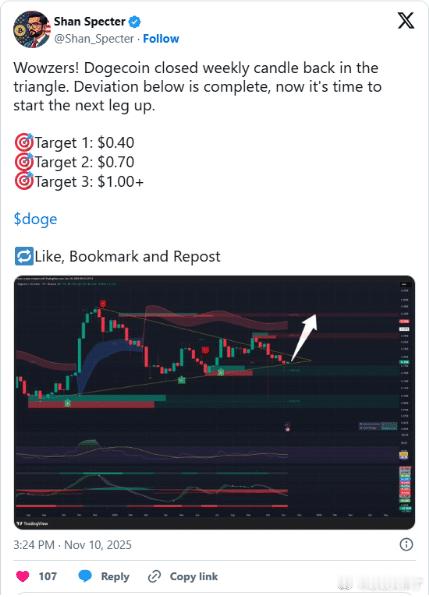 狗狗币最近又要“搞事情”了!价格一直卡在 0.185 美元附近,这个位置从 11 月 3 日以来就像一堵墙一样挡着它,只要成功突破,市场才有机会冲向 0.19–0.20 美元 区间。从技术面看,RSI 现在在 44.75,虽然还没站上中性线,但趋势略微抬头;另一方面,RSI 的移动均线也在往 50 靠,这说明市场情绪现在偏中性,大家都在等一个方向。分析师的目标倒是给得挺猛。钱德勒认为,狗狗币未来 32 天可能涨到 0.30 美元;斯佩克特则在对称三角形突破后设了三个目标:0.40、0.70 和 1.00 美元。更夸张的是 Osemka8,他直接搬出了历史周期,认为 有机会重演 2017 和 2021 的走势,甚至冲到 3.10 美元。能不能飞那么高没人敢打包票,但这波想象空间确实越来越大了。🚀
