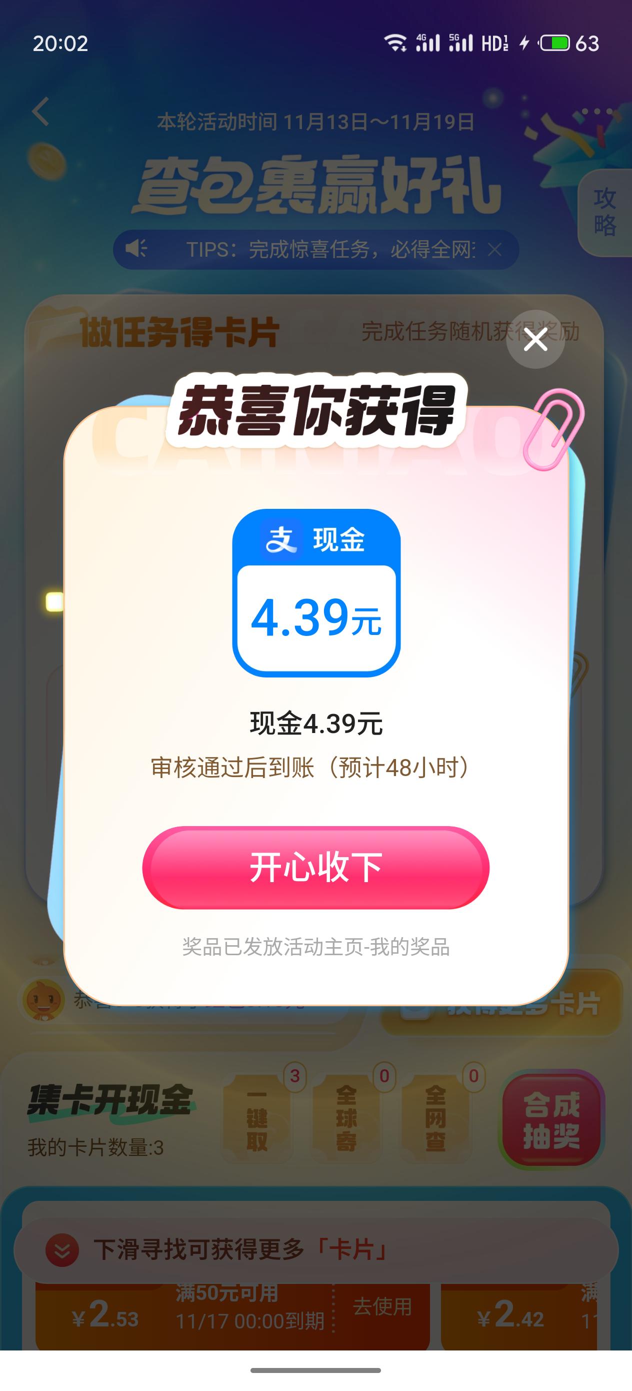 到账啦 菜鸟APP 包裹赚赚 浏览🉐卡 然后合成可以🉐红包🧧 免费薅羊毛